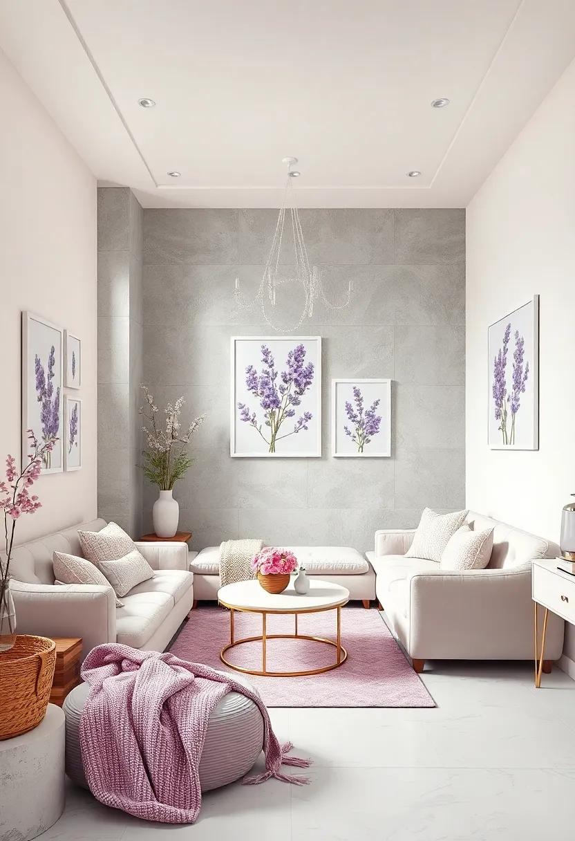 Incorporate lavender-inspired artwork or prints in white frames for a cohesive look