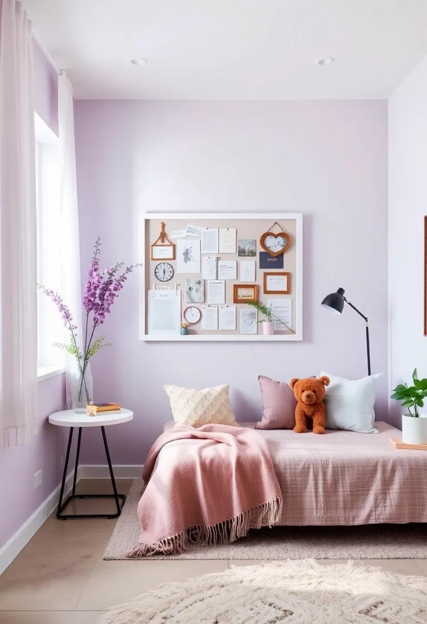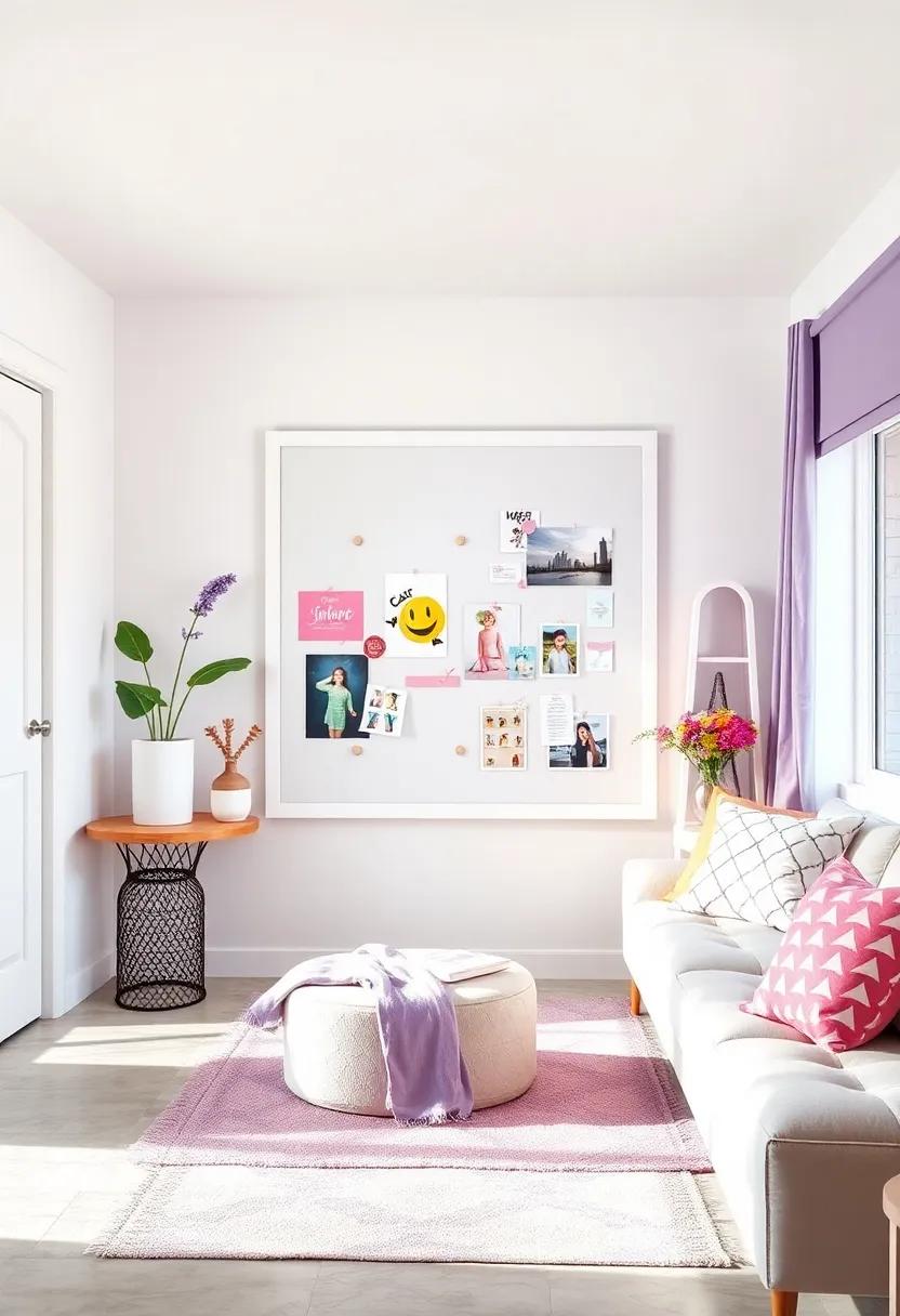 To make this area even more engaging, use colorful pushpins or washi tape in shades of lavender, gold, or soft pastels to pin your inspirations. You can create a visually appealing arrangement by layering different sized images and note cards.Pair this setup with a white desk or a soft lavender rug beneath to define the space further. Add some greenery with small potted plants or succulents nearby to bring life into the corner, fostering an environment that enhances creativity and offers a dreamy escape for reflection and planning.