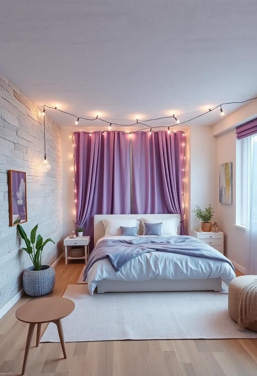 use string lights wrapped in lavender fabric to create a dreamy ambiance in the room