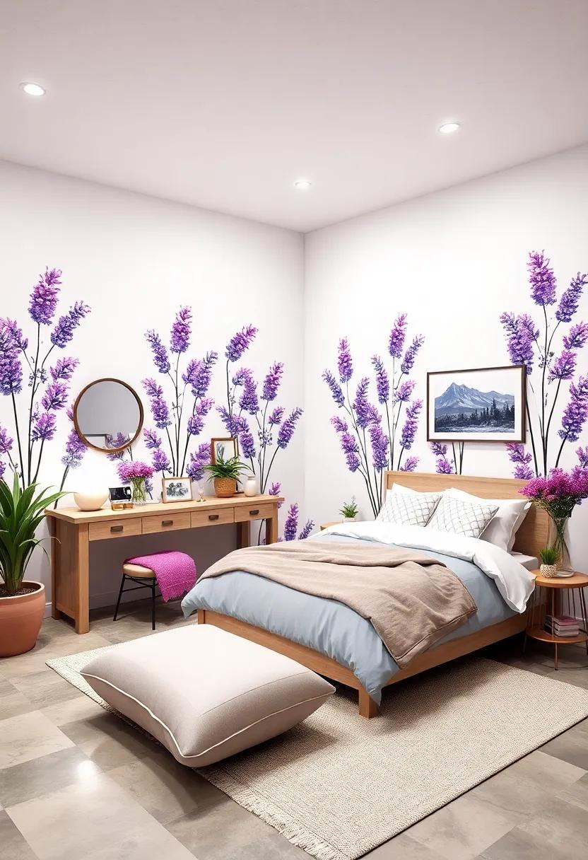 To create a seamless blend of lavender and white in your teen’s room, incorporating lavender-inspired artwork is a perfect choice. Choose prints that highlight various shades of lavender, from soft pastels to deeper hues, ensuring they harmonize with the overall color palette. Look for pieces that showcase whimsical elements like floral designs, dreamy landscapes, or even abstract art that resonates with the calming essence of lavender. Hang these prints in sleek, white frames to add a touch of elegance, allowing the surrounding décor to shine while keeping the room cohesive.