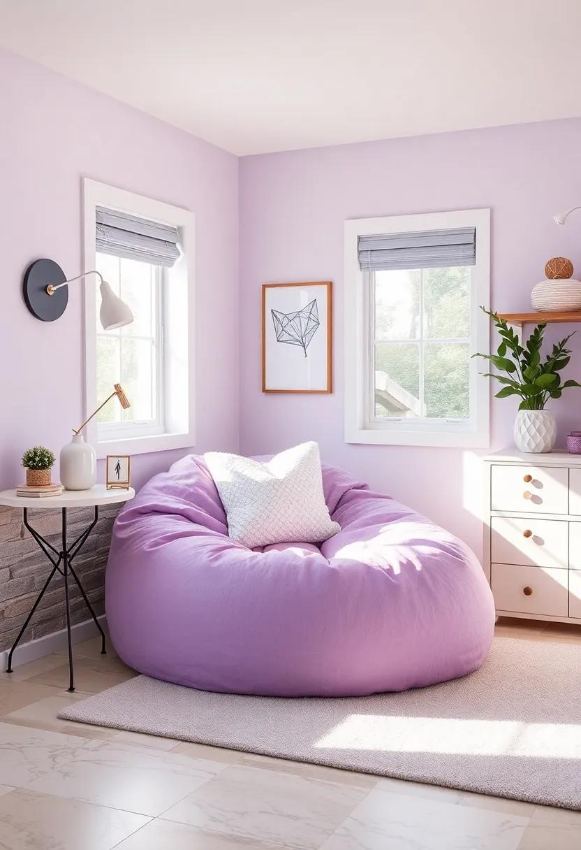 Introduce a cozy reading nook with a plush lavender bean bag and fluffy white throw pillows