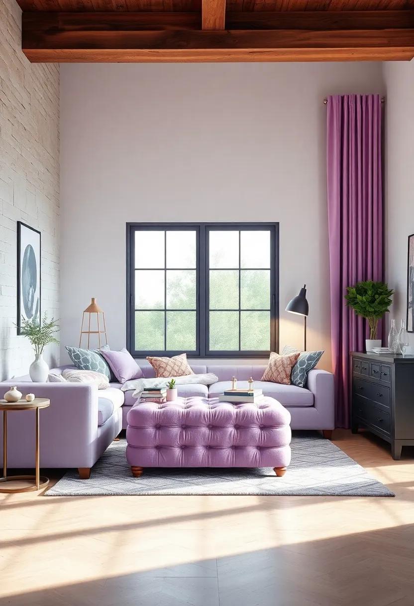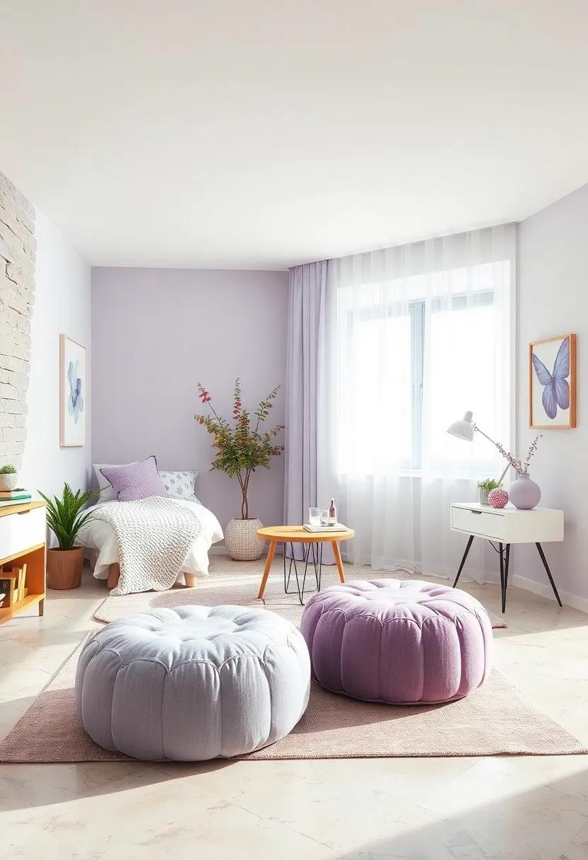 Incorporate a soft lavender pouf as a multifunctional seat or footrest