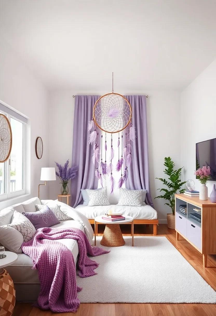 Create a dreamcatcher adorned with lavender feathers and beads for a unique focal point