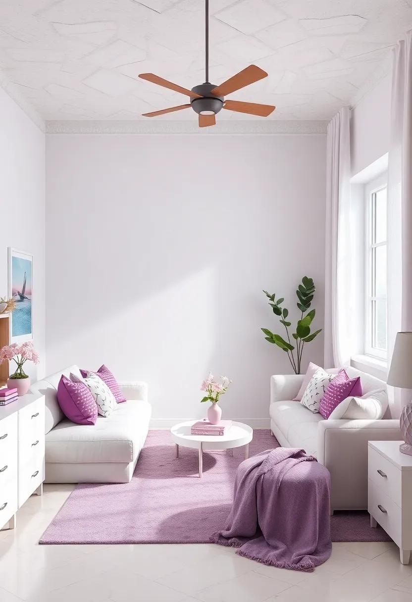 - Rugs: A plush lavender rug can ground the space while softening the starkness of white.