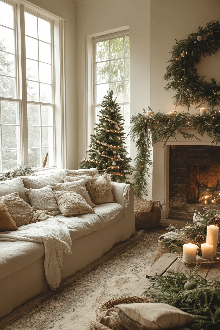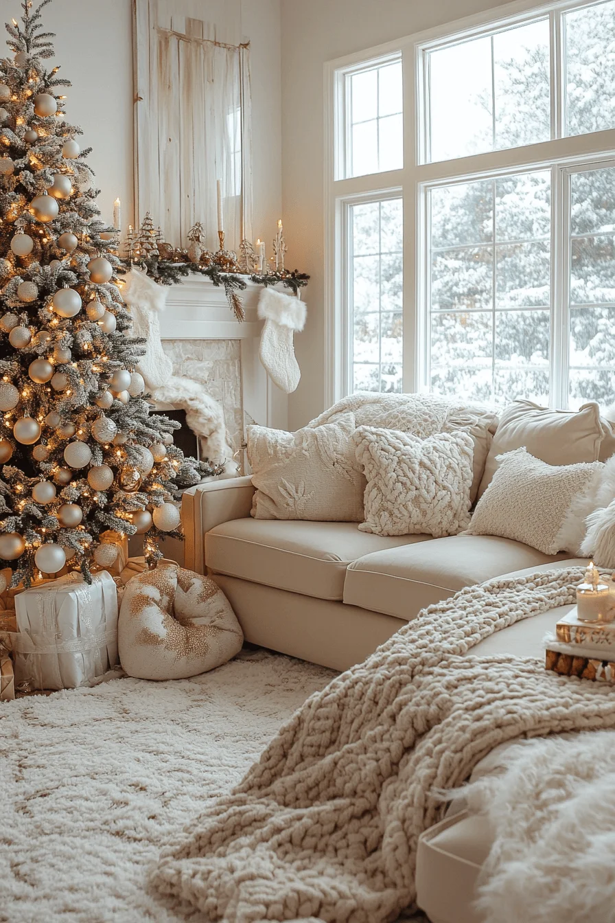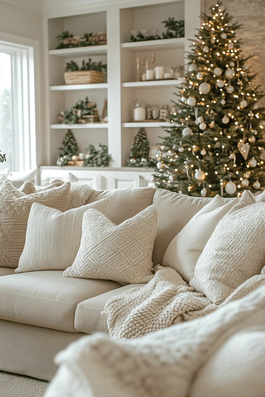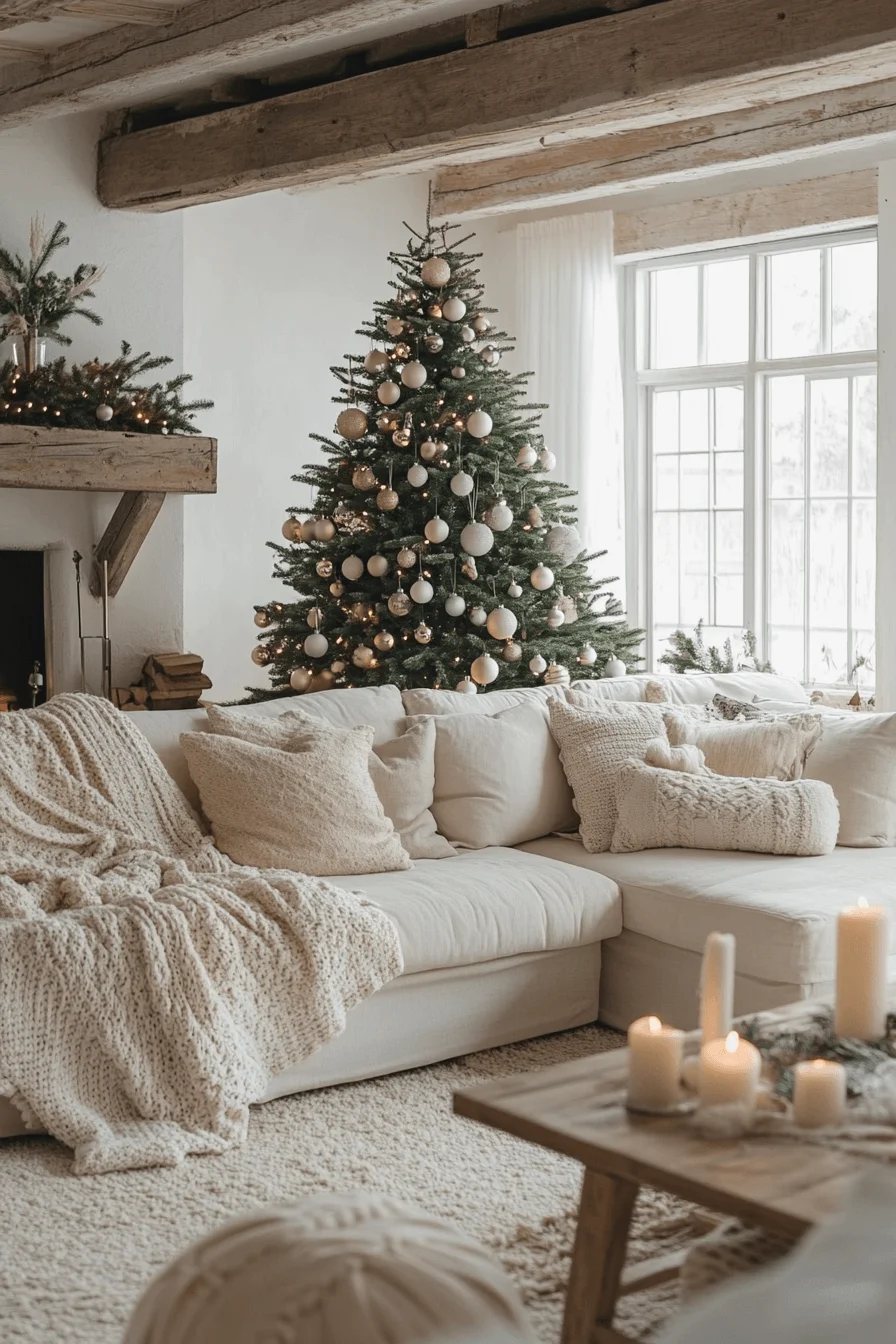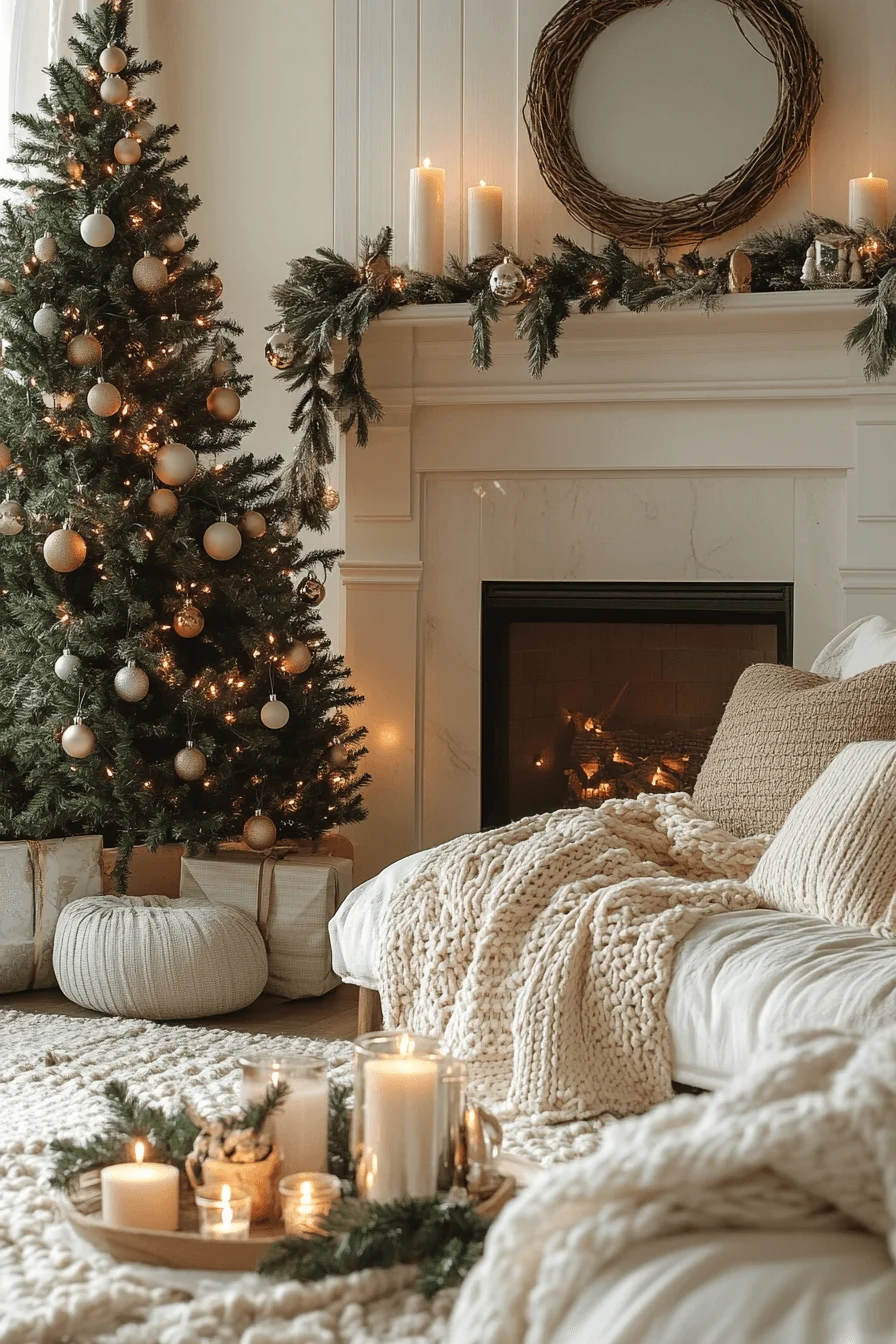 Soft shades of beige, cream, and ivory create a serene canvas for elegant Christmas décor. Incorporate textured throws and knitted cushions to add warmth without overpowering the space. A Christmas tree decorated with subtle metallic and white ornaments harmonizes the look, offering a refined yet inviting atmosphere that whispers festive tranquility.