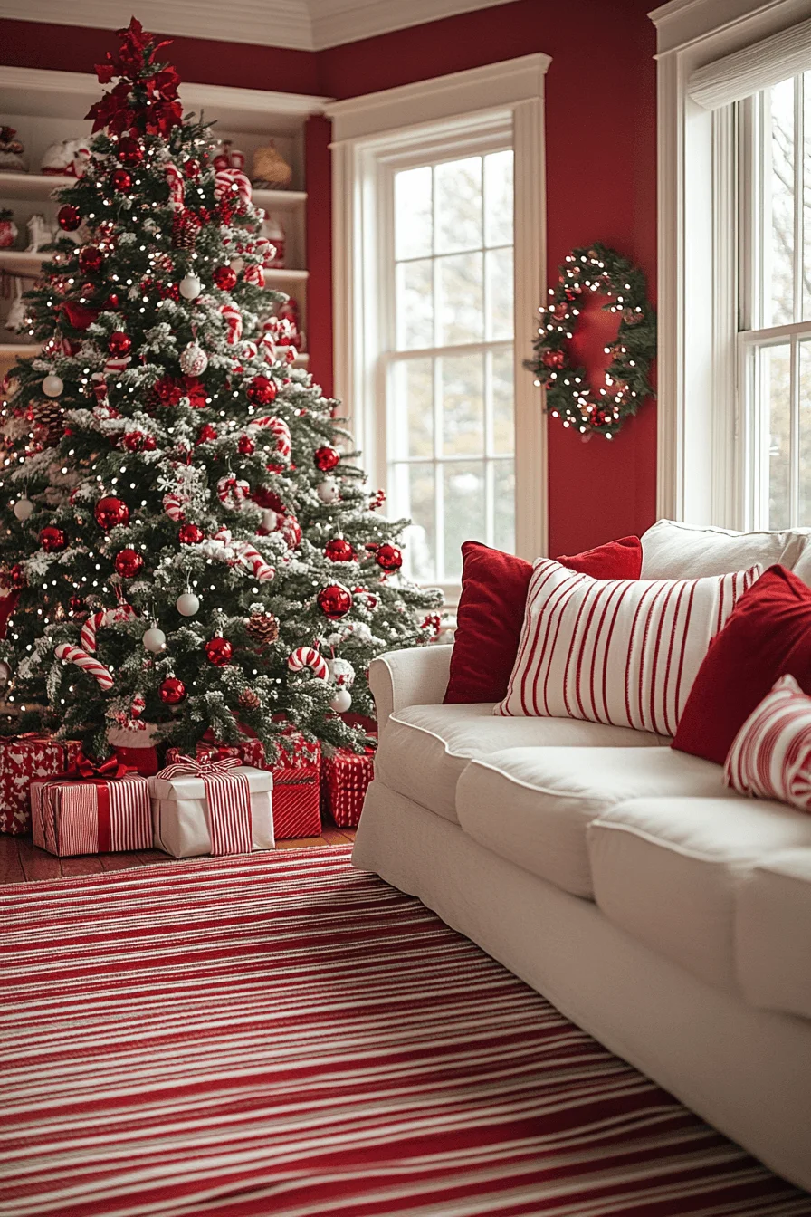 The timeless combination of red and white instantly evokes holiday cheer. Striped patterns, joyful ribbons, and radiant ornaments bring a nostalgic warmth to your living room. Complement with cozy throws and frosted details for a balanced and inviting look.