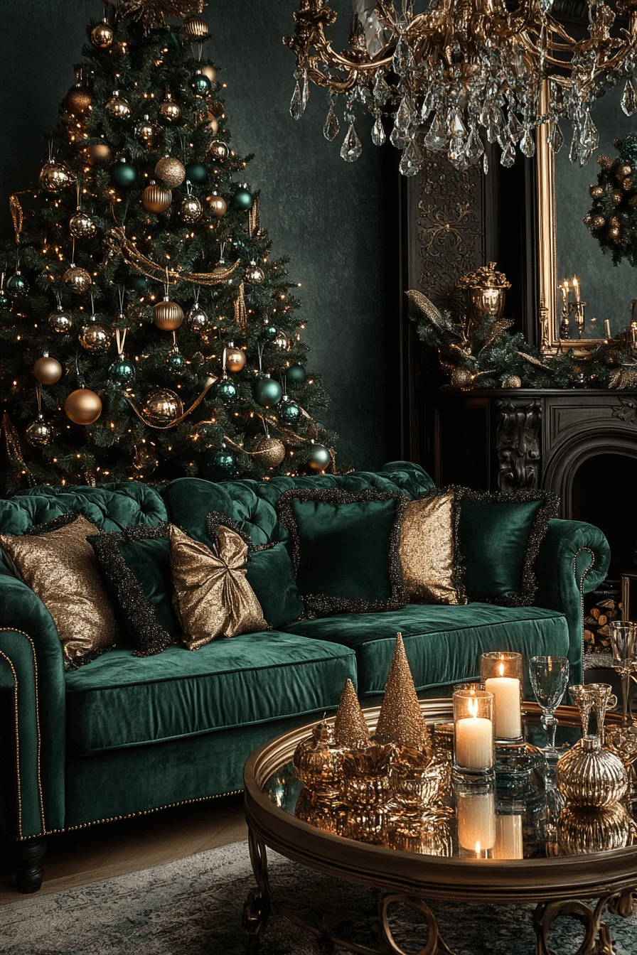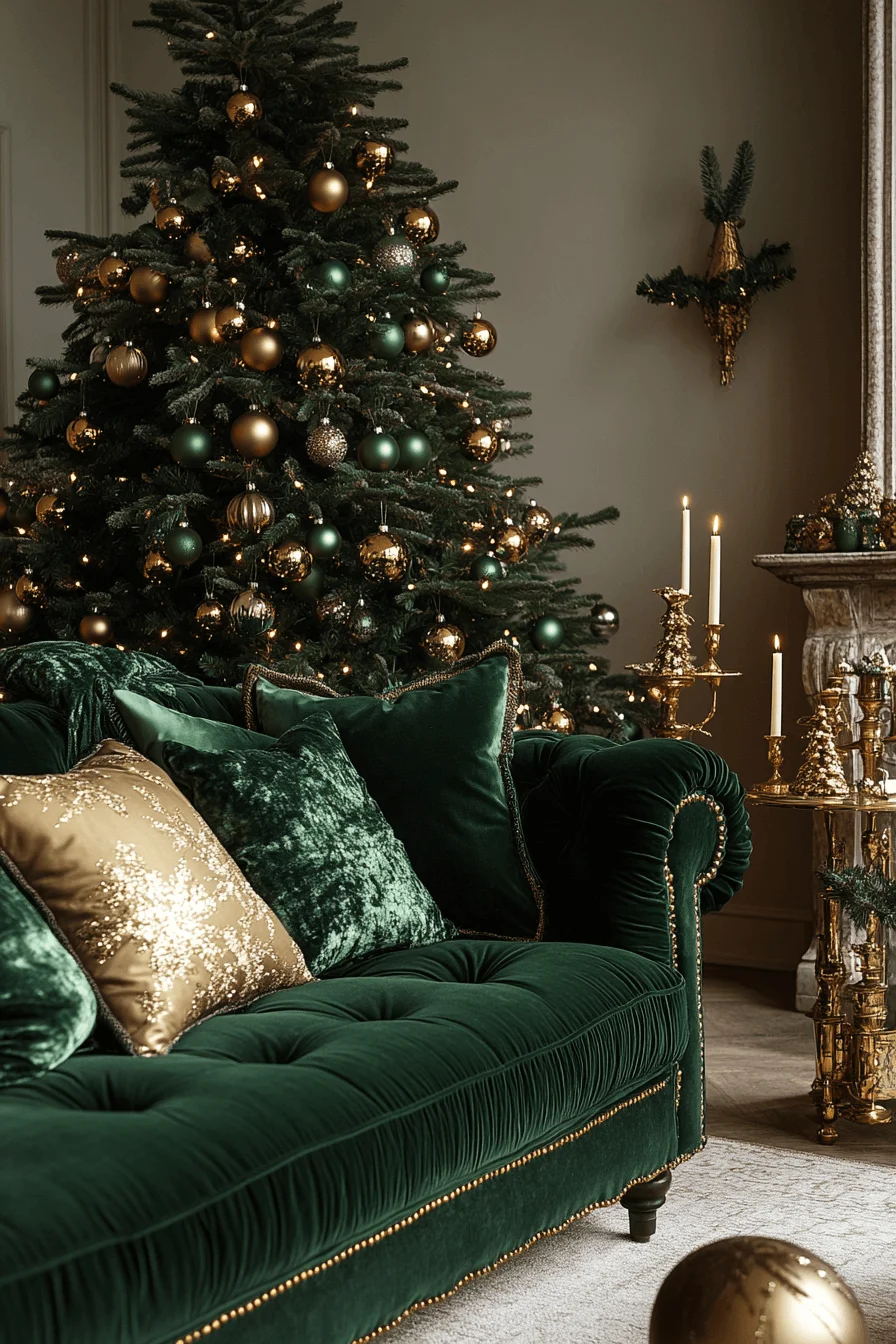 Deep emerald greens paired with shimmering gold accents evoke a sense of opulence and comfort. Velvet throws and golden candles enhance the richness of the textures, creating a living room that feels both glamorous and cozy. Every golden gleam is thoughtfully placed to elevate the festive mood.