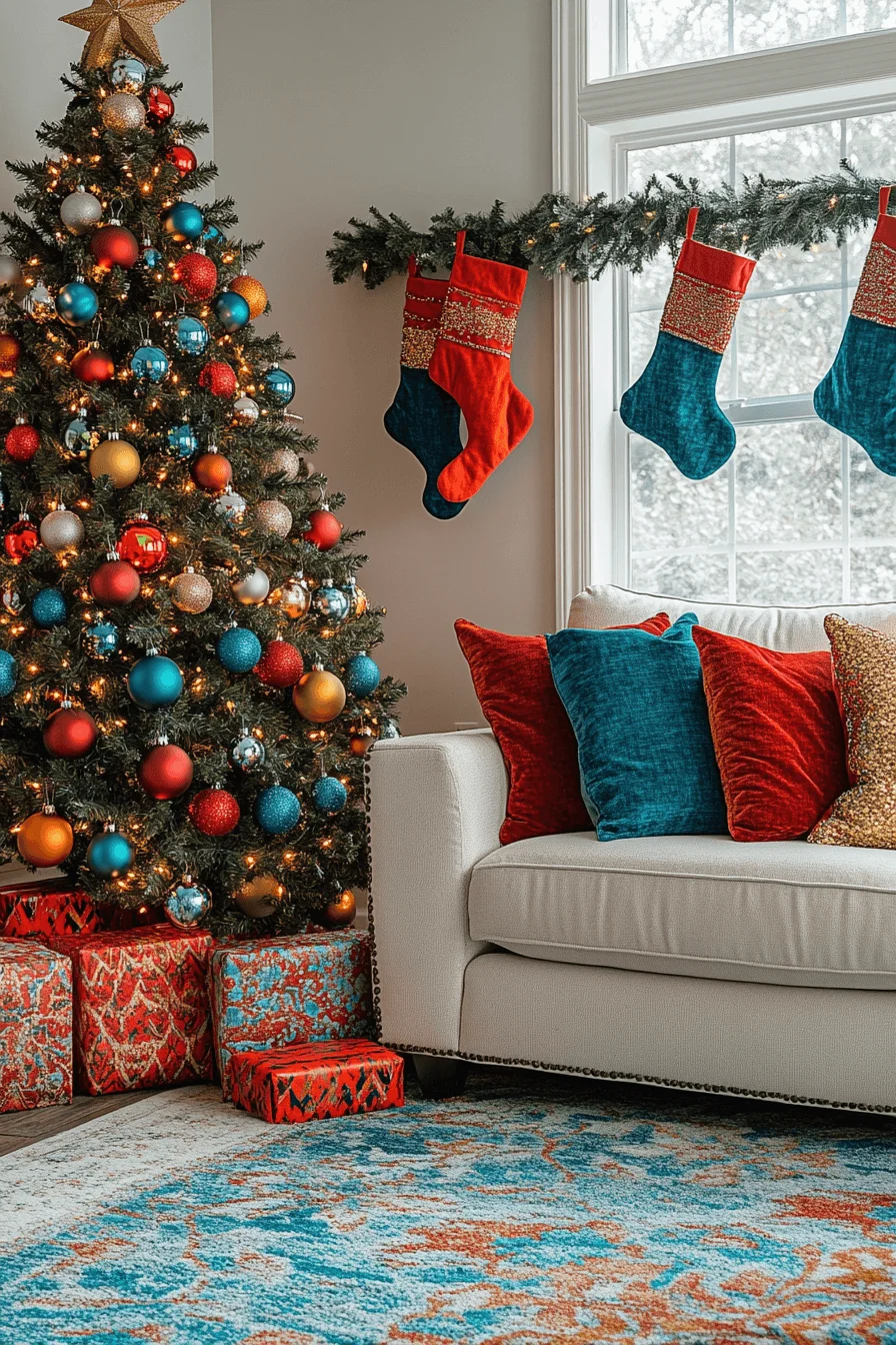 Infuse your living room with vibrant hues that celebrate the season’s joy. Rich jewel-toned ornaments, colorful cushions, and lively garlands create a dynamic and cheerful environment. This playful mix of colors energizes the space and invites festive creativity.