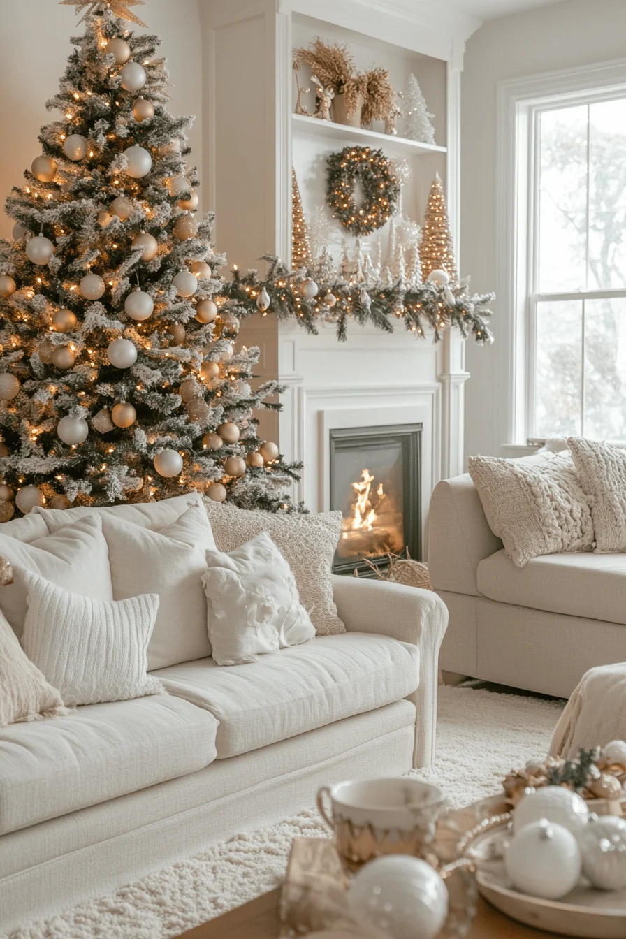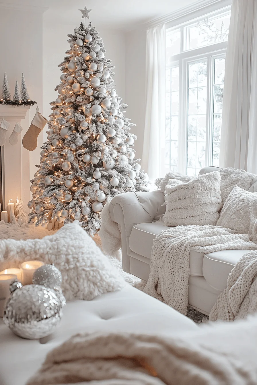 Transform your home into a serene winter escape with an all-white theme. Plush fabrics, crystal embellishments, and snowy garlands create an airy, elegant ambiance. Adding flickering candles introduces warmth and balance, making the space feel both festive and tranquil.