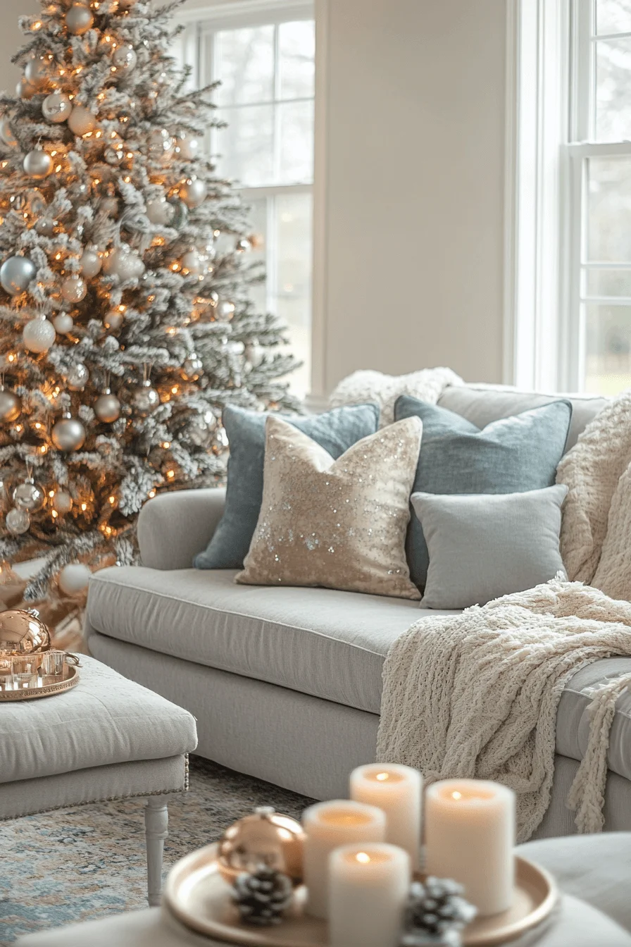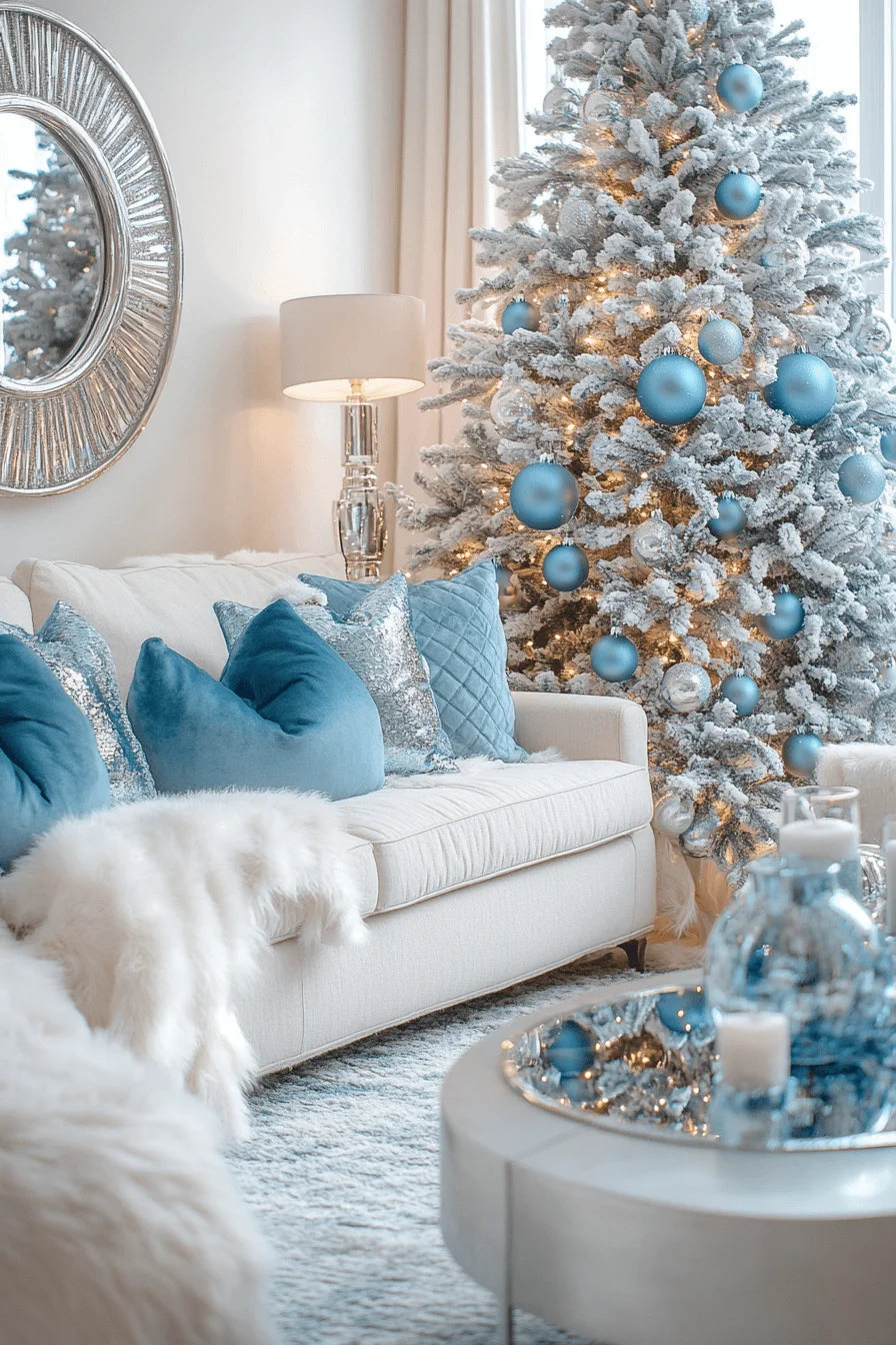 Cool blues paired with shimmering silver accents reflect the quiet beauty of winter evenings. Soft textiles and metallic ornaments sprinkled with sparkle create a peaceful yet festive atmosphere. The subtle glimmer mimics the gentle fall of snowflakes, adding a magical touch.
