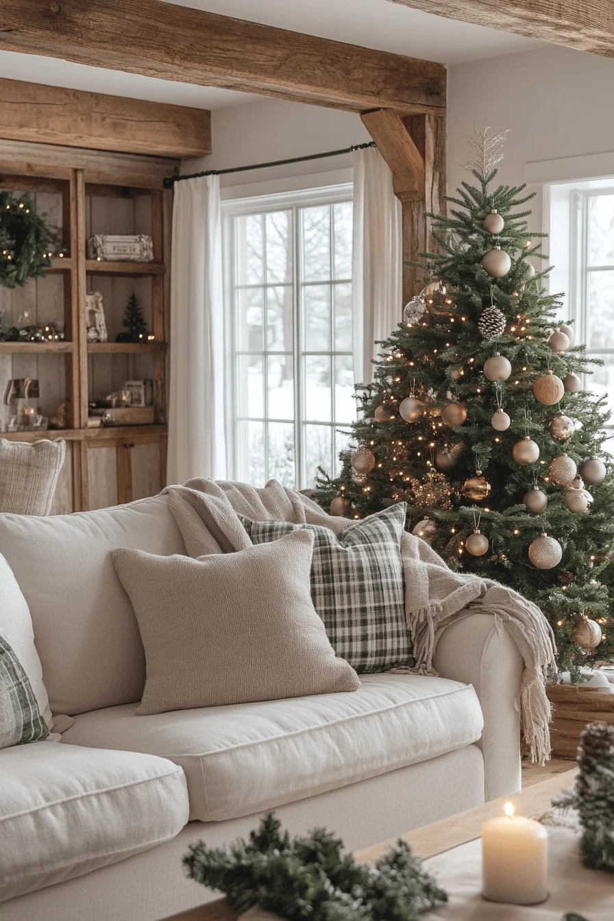 Combine rustic wood textures, plaid patterns, and natural greenery to create a warm farmhouse holiday vibe. A simple tree adorned with handcrafted ornaments adds authenticity. Layered blankets, lanterns, and candles complete this cozy, heartwarming setting.