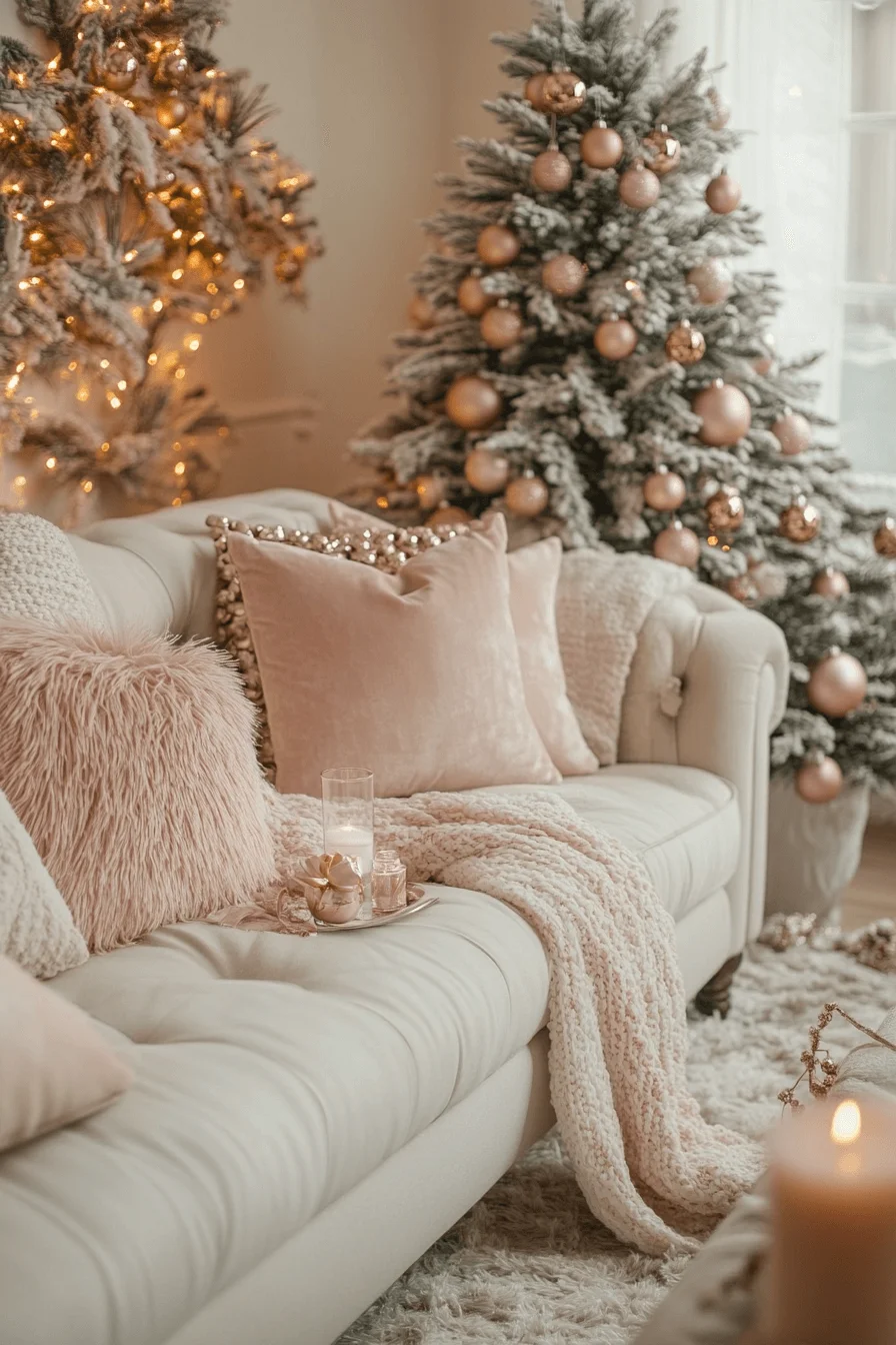 Soft blush hues combined with rose gold accents create a dreamy and elegant holiday setting. A rose-gold tree adorned with pink ornaments and gentle lighting offers a fresh yet cozy ambiance, perfect for a modern, feminine touch.
