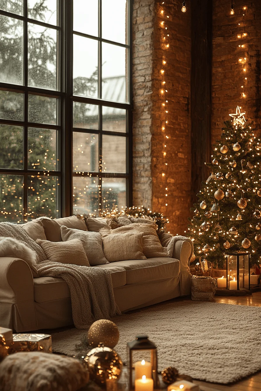 Embrace gentle beige tones combined with twinkling lights to craft a tranquil and elegant holiday haven. Layered knits, faux fur accents, and touches of gold create a luxurious yet calming environment. This neutral scheme allows your Christmas tree’s glow to take center stage, enveloping the room in soft warmth.