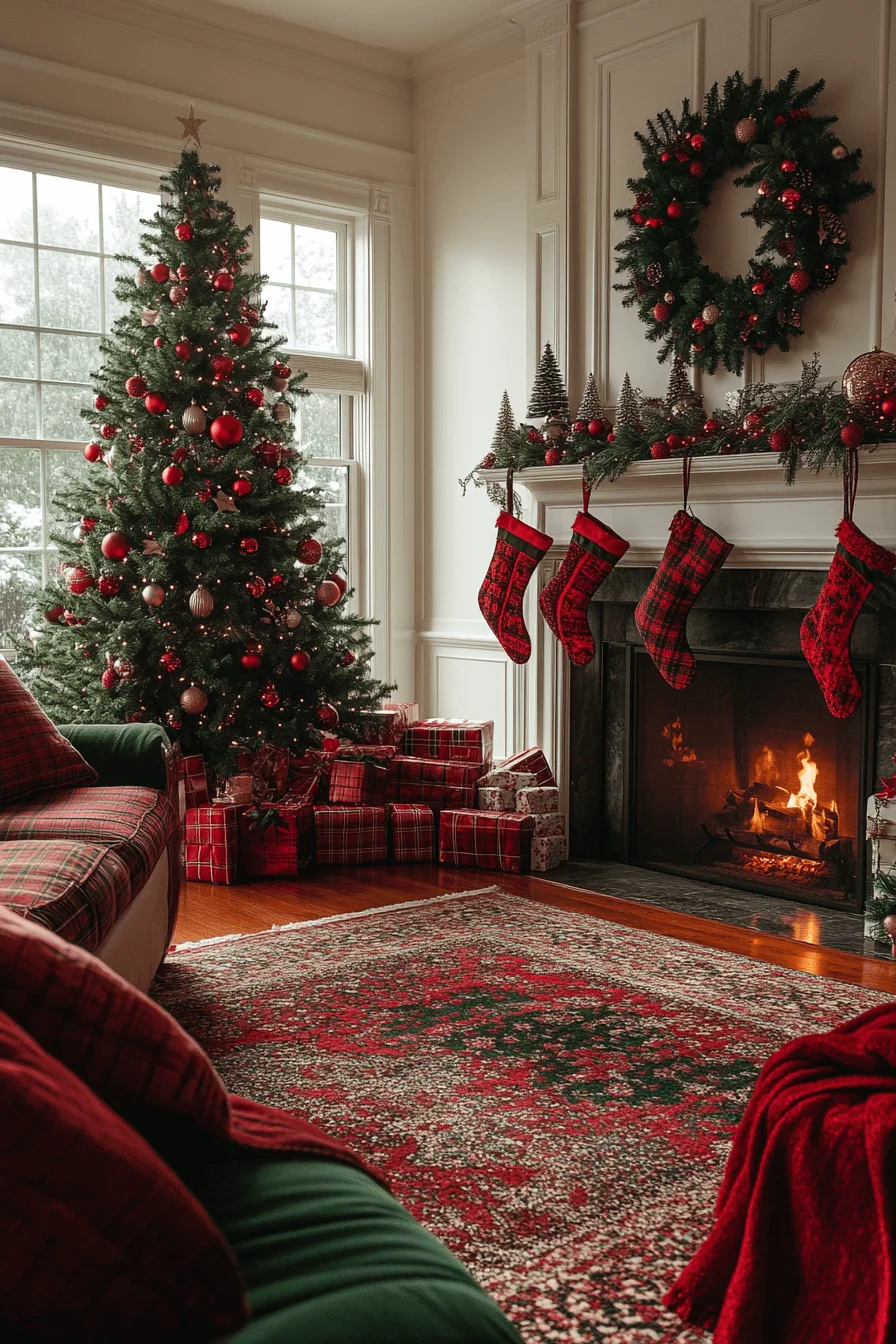 Classic red and green hues evoke the quintessential holiday feeling. Lush garlands, twinkling lights, and cozy textures fill the room with nostalgic warmth, making it feel like a true holiday homecoming.