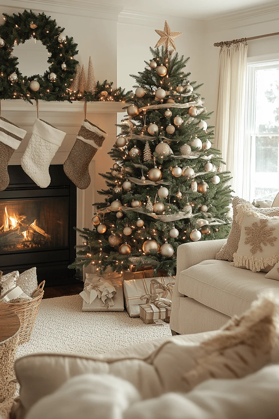Embrace minimalist elegance with neutral tones and clean lines. A streamlined tree decorated with metallic ornaments adds subtle sparkle without overwhelming the space. This modern approach offers a calm, sophisticated holiday vibe.