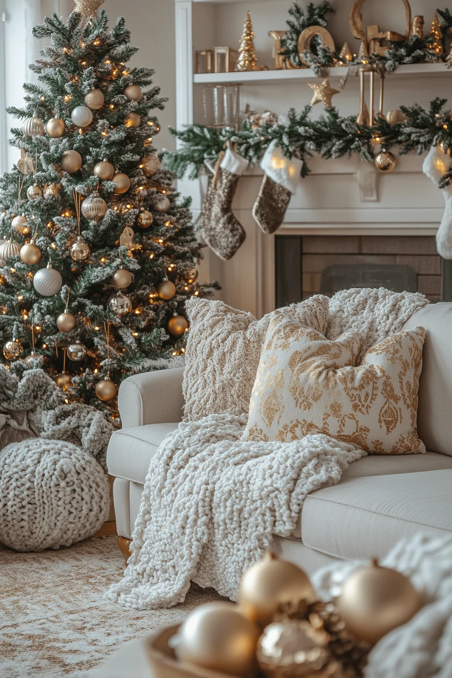 Combine soft garlands, textured cushions, and layered fabrics to create a warm and inviting holiday retreat. The blend of materials adds depth and richness, while golden ornaments and fairy lights provide a final festive sparkle.