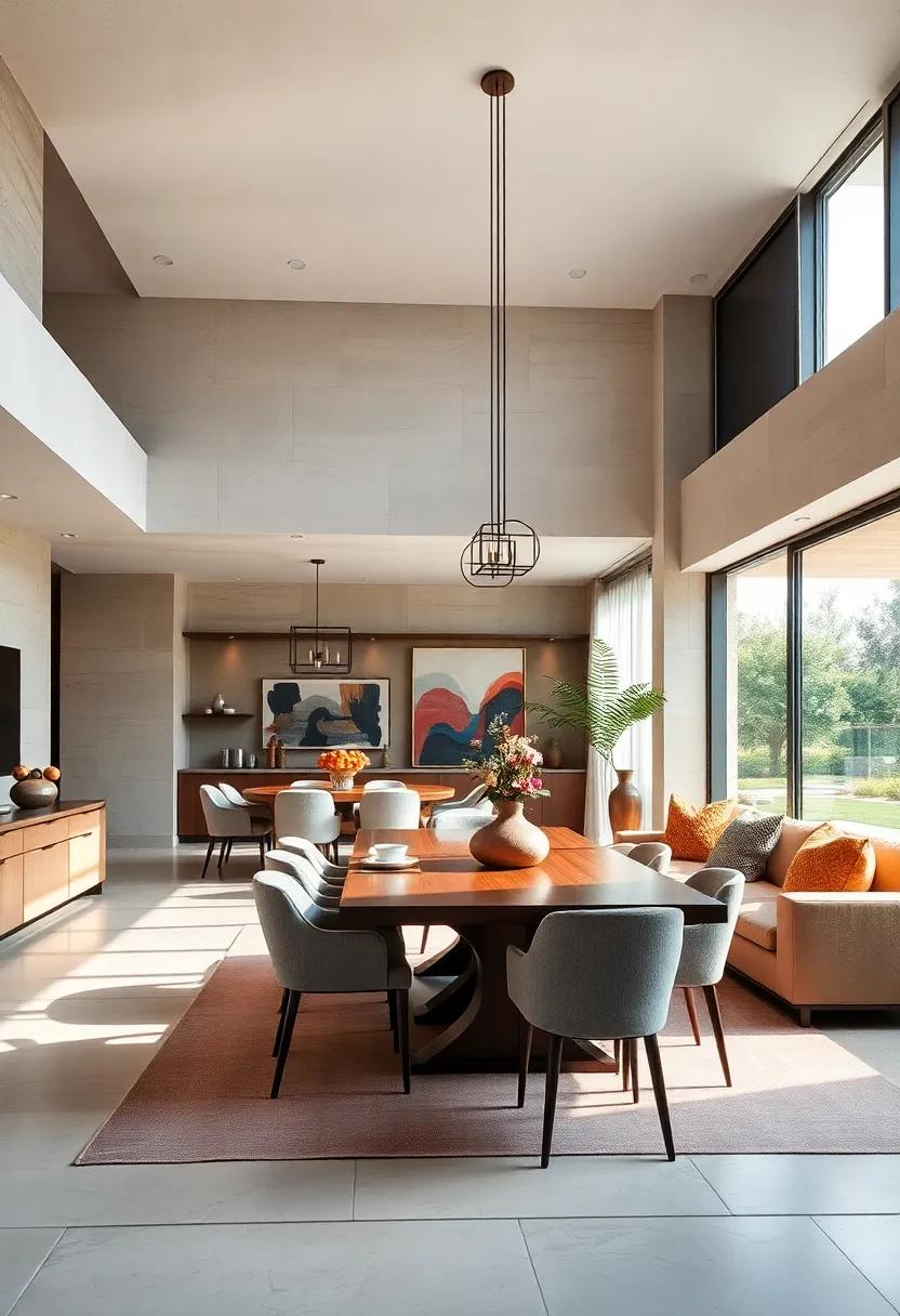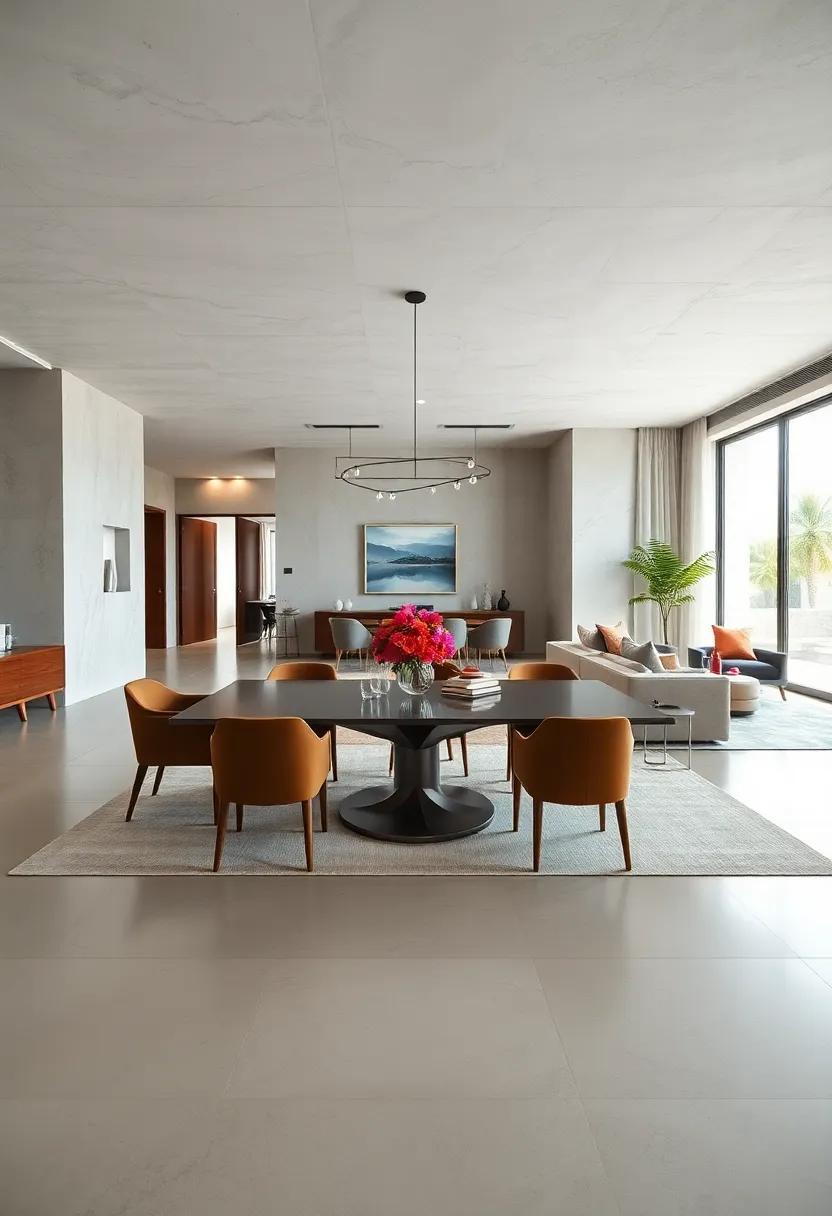 Embrace Minimalism: Use a neutral color palette and sleek furniture to create an airy feel that highlights the spaciousness of your open-concept dining and living areas