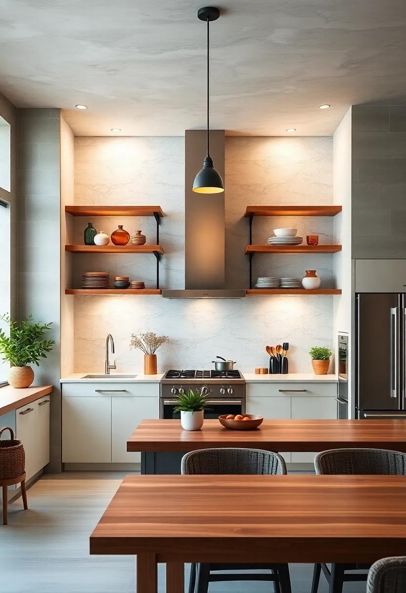 Open shelving offers a unique blend of functionality and aesthetic appeal, allowing you to exhibit your most treasured kitchenware and decorative items. Imagine a beautifully organized display featuring a mix of colorful dishes, artisan bowls, and charming glassware. This design choice not only transforms the visual dynamics of your kitchen but also makes it feel more airy and spacious. The absence of closed cabinets invites light to flow freely, creating a warm ambiance that enhances your culinary space. To add a personal touch, consider incorporating seasonal décor or family heirlooms that reflect your personality and style.
