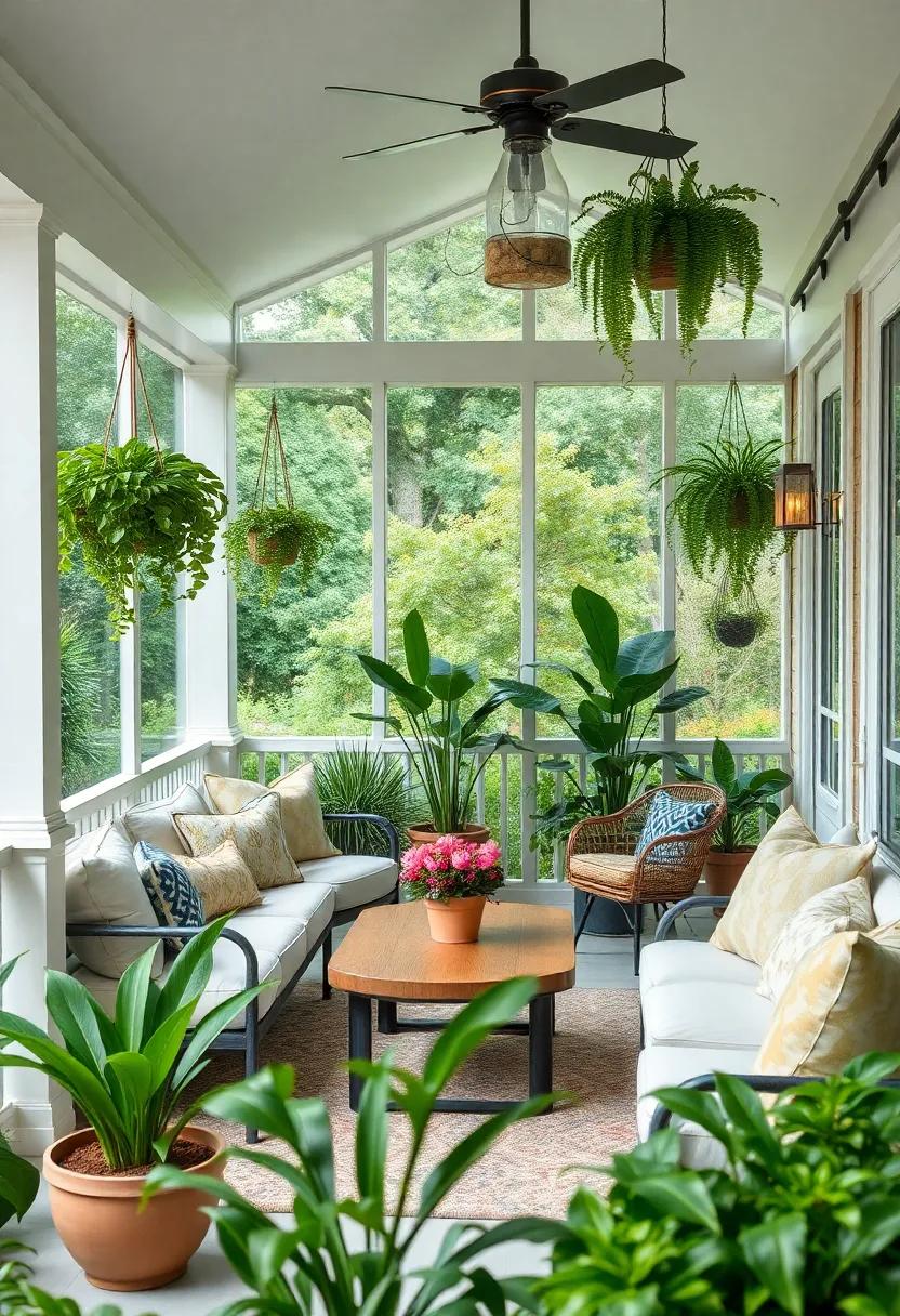 botanical Bliss: Transform your porch into a vibrant indoor garden, filled with lush greenery and hanging plants, offering a refreshing escape