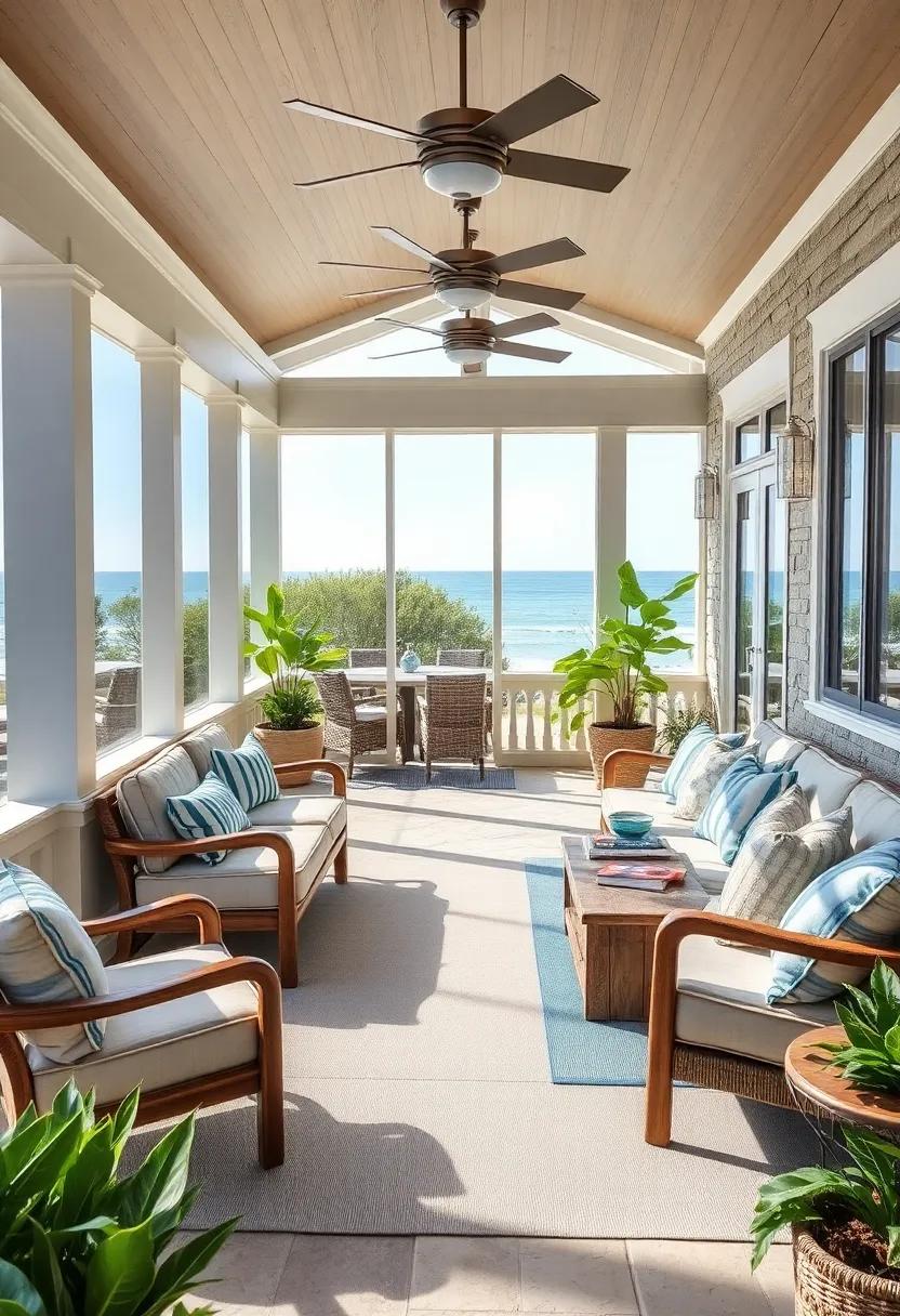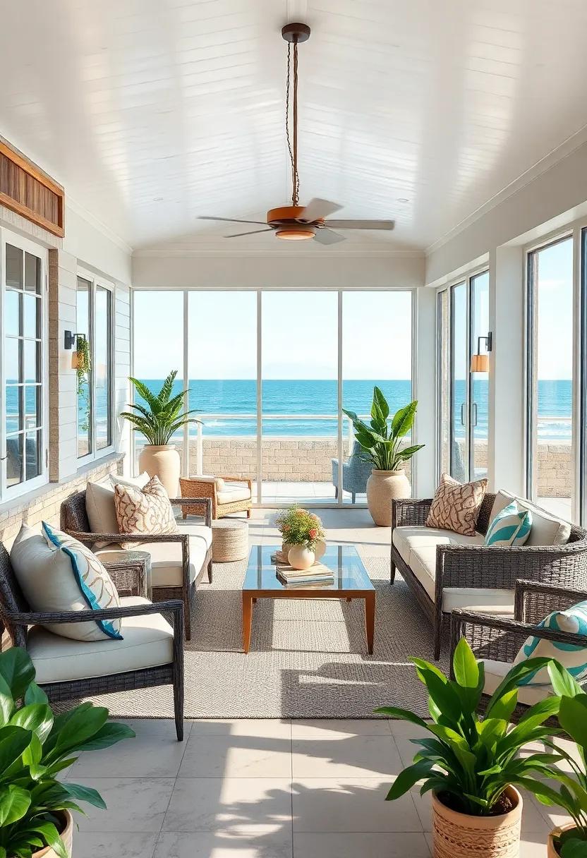 To enhance the coastal experience, consider the addition of stunning ocean views framed by expansive windows or screens. This design encourages the outdoors to pour in, eliminating boundaries and creating an uninterrupted visual feast. Elements such as a textured jute rug, oversized comfy cushions, and rustic wicker furniture can anchor the space, providing a cozy atmosphere perfect for lounging or entertaining. Balancing style and comfort, you can invite the salty breeze in without compromising luxury.