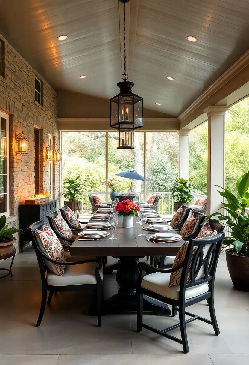 Elegant Dining Space: A sophisticated design incorporating a formal dining table, elegant lighting, and exquisite decor creates an enchanting setting for outdoor dinners