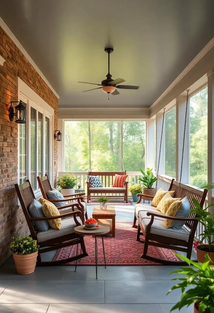 Farmhouse Flair: A classic farmhouse-inspired porch featuring oversized rocking chairs, a swing, and rustic decor that exudes warmth and hospitality