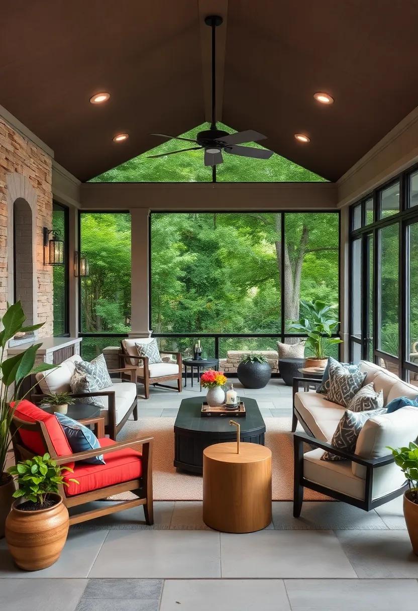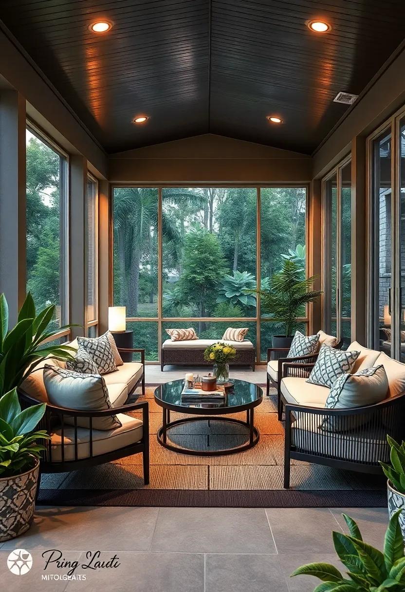 Comfort is key in this luxurious retreat. Picture deep, oversized armchairs and sectional sofas adorned with soft cushions, inviting you to sink in and relax. The layout encourages conversation and connection, whether you’re hosting a gathering or enjoying a quiet evening. To enhance the experience even further, consider incorporating a stylish fire pit table that warms both body and spirit. With unobstructed views, every evening becomes an invitation to marvel at nature’s nightly display, turning your screened porch into the ultimate venue for relaxation.