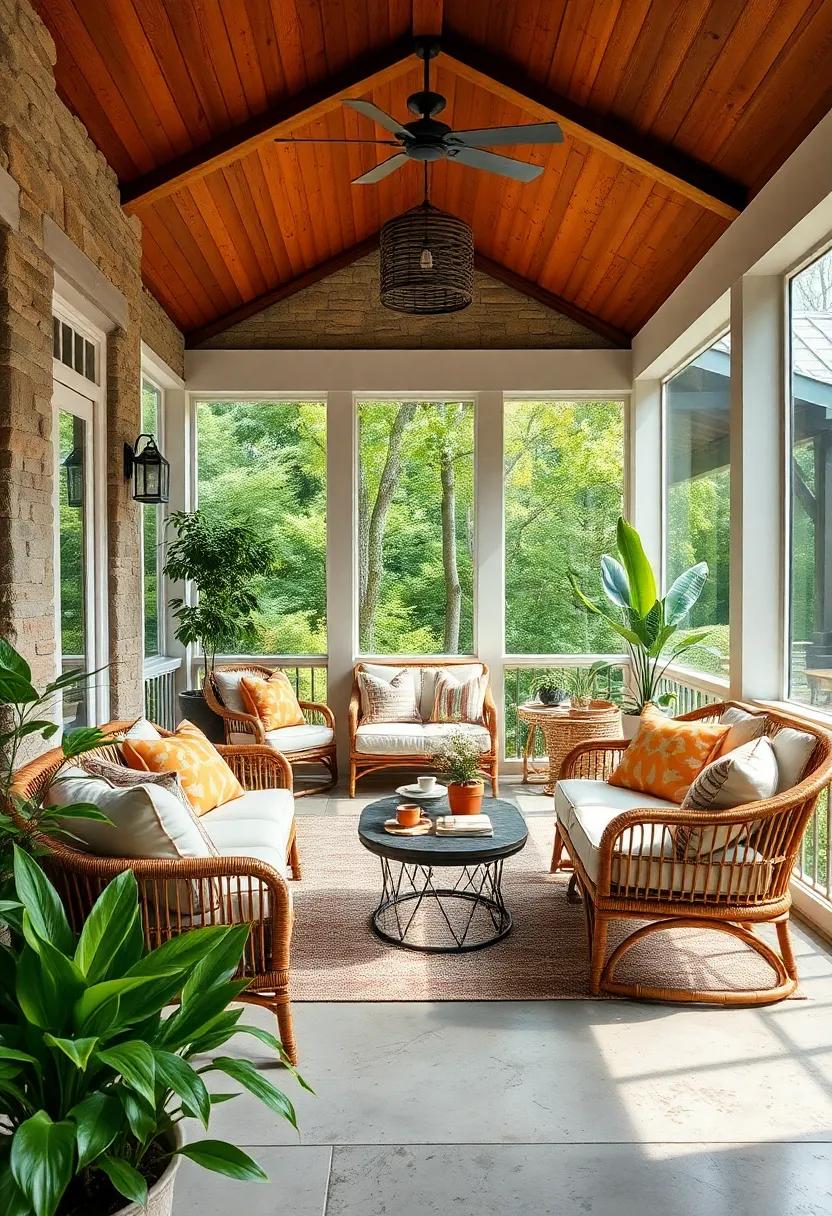 Serene Sanctuary: A tranquil screened porch adorned with bamboo furniture and soft linens, perfect for afternoon tea amidst nature’s beauty