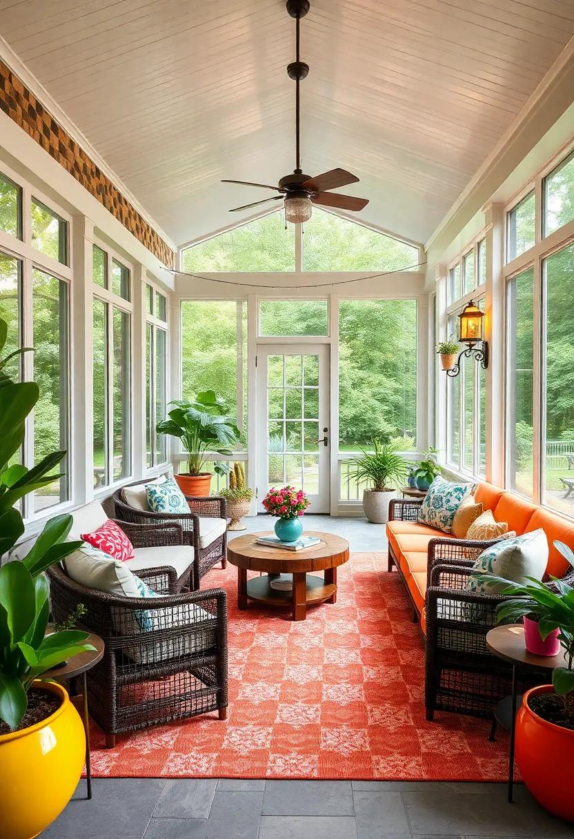 Whimsical Wonderland: Bright colors, quirky furniture, and playful decorations make this screened porch a fun and whimsical space for family gatherings