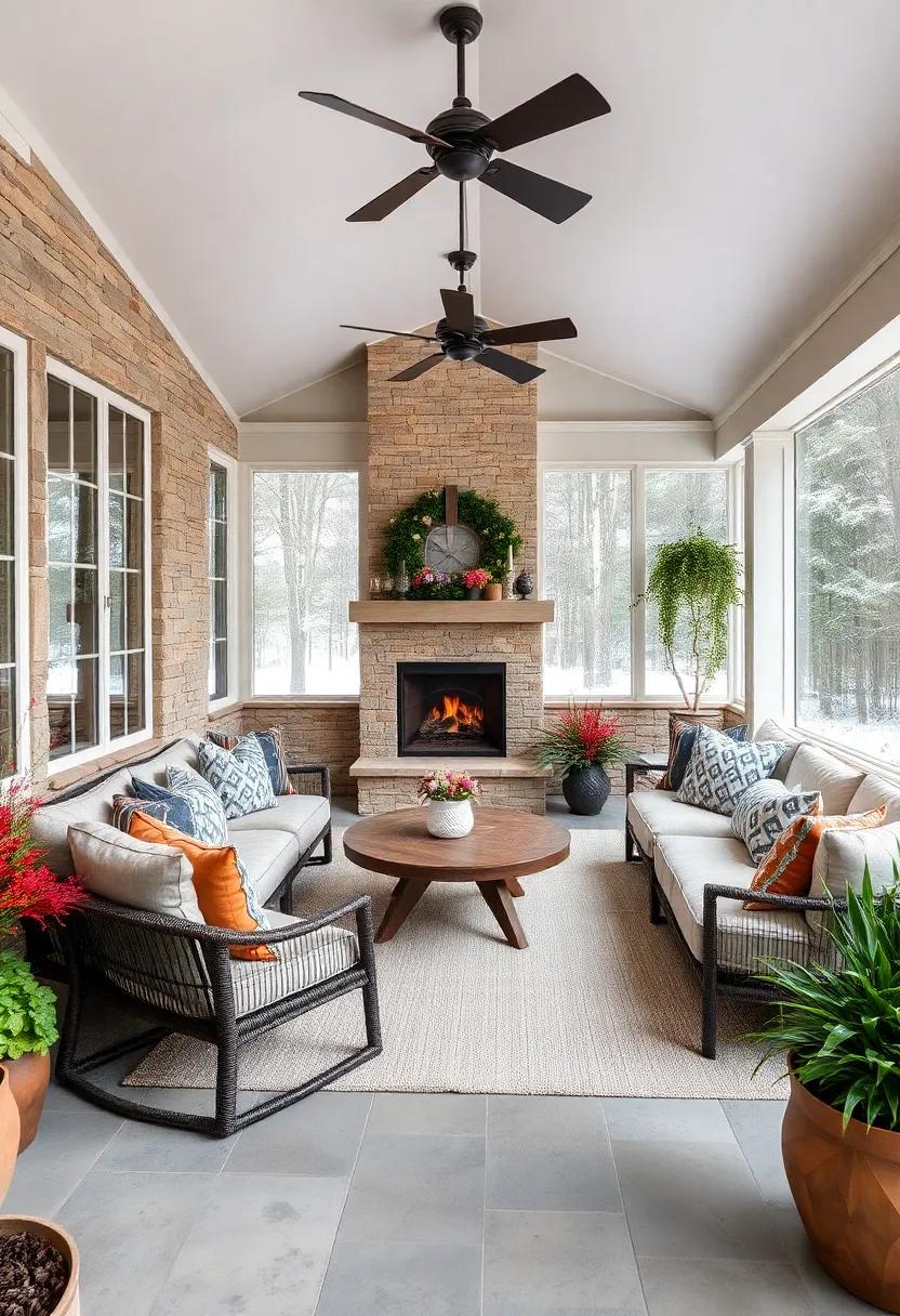 Winter Wonderland: Cozy up in style with sectional seating, layered textiles, and a fireplace, turning your screened porch into a warm winter retreat