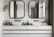 This design balances modern rustic textures with sleek lines to create a refined yet welcoming atmosphere. The TV wall above the fireplace features structured trim painted in muted taupe, contrasted by black window frames and minimalist sconces that add an industrial edge. Soft upholstery and natural wood surfaces are thoughtfully mixed to maintain warmth. This space exemplifies how modern farmhouse interiors can be elegant without sacrificing coziness—ideal for lovers of clean, sophisticated design.