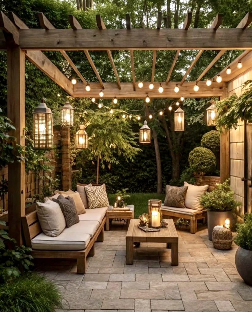 2. Rustic Lantern-Illuminated Pergola Lounge