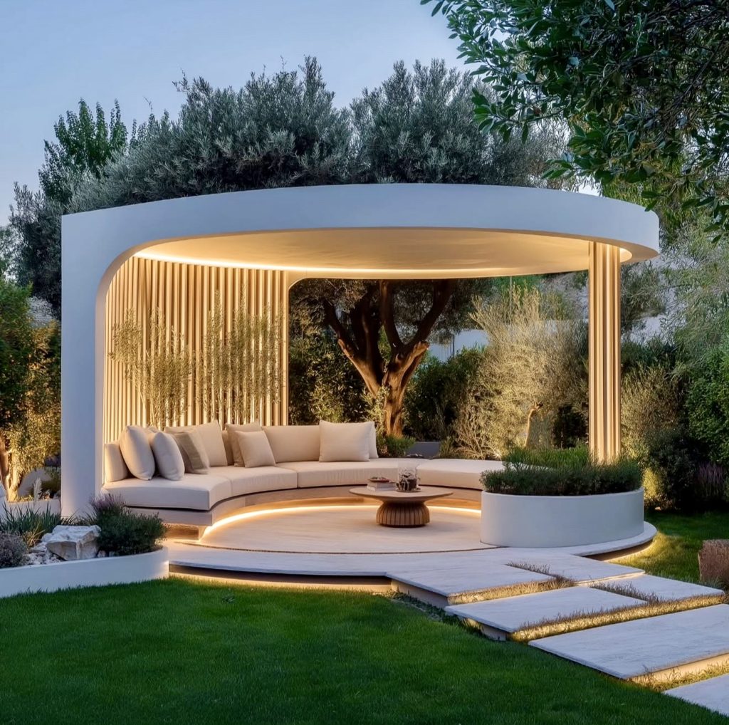 Showcasing modern elegance, this white gazebo features a graceful curved design complemented by integrated LED lighting along the floor and ceiling, casting a gentle glow. The circular seating arrangement creates a communal outdoor lounge that balances minimalism with luxury. The combination of natural greenery and clean architectural lines maintains a fresh, uncluttered vibe. Though it represents a higher investment, this design is a striking centerpiece worthy of magazine spreads.
