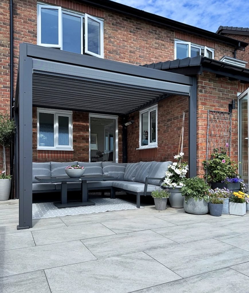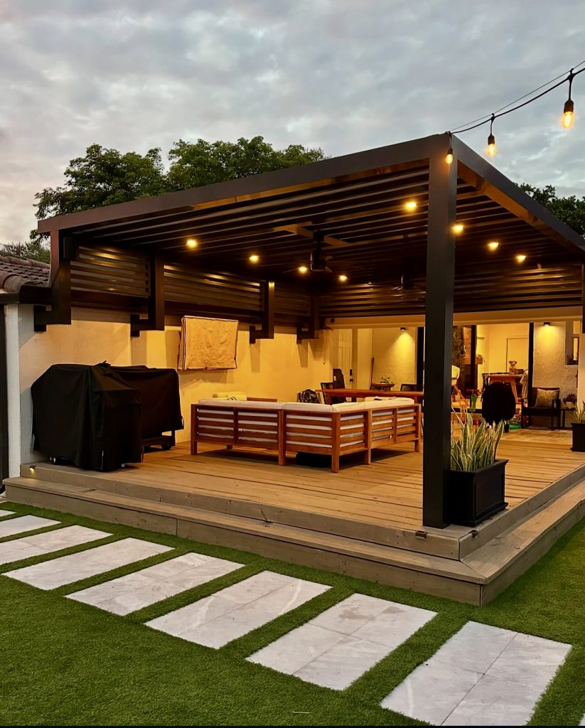 Integrating seamlessly with the home, this attached pergola features dark framing and clean lines for a sophisticated look. The corner sectional sofa maximizes seating, while a variety of planters soften the structure’s sharp edges with natural greenery. This minimalist yet functional design is perfect for those seeking a covered outdoor living space that balances simplicity and elegance.