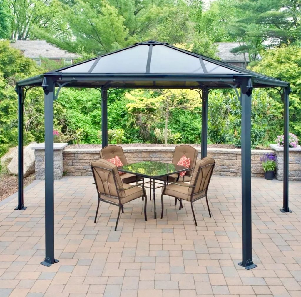 This sleek metal-framed gazebo with a transparent glass roof offers a timeless design that fits various backyard styles. The dark frame contrasts elegantly with the glass, allowing natural light while providing shelter. A compact dining setup underneath makes it perfect for family meals or casual gatherings. Its octagonal shape adds subtle architectural interest, and its affordability and durability make it accessible for many homeowners.