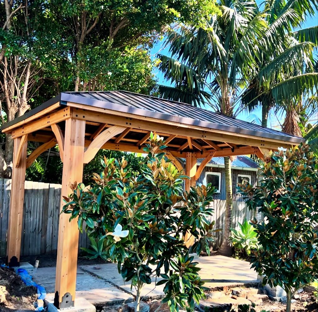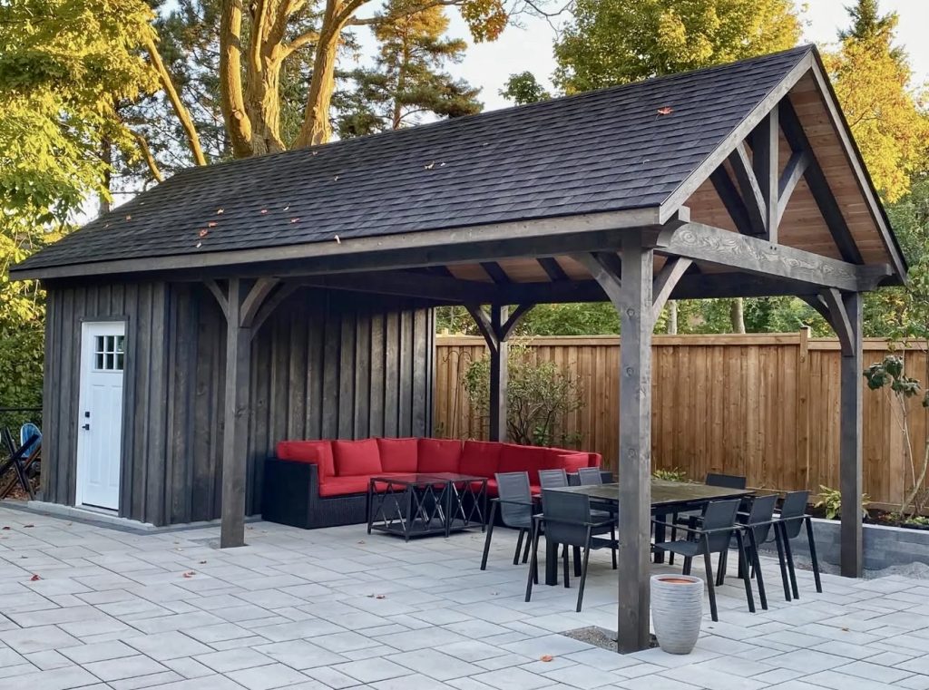 This wooden gazebo cleverly incorporates a built-in shed, combining style with practicality. The pitched roof adds rustic charm, while the bold red sectional sofa injects vibrant color. The covered area offers ample shade for dining or lounging, and the dual-purpose design provides valuable storage space, enhancing backyard functionality and long-term value.