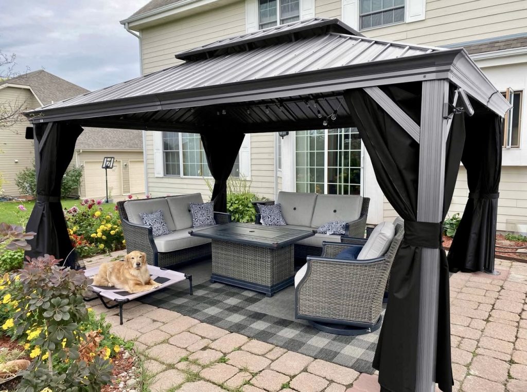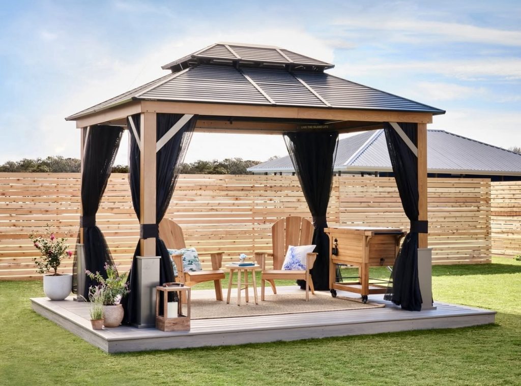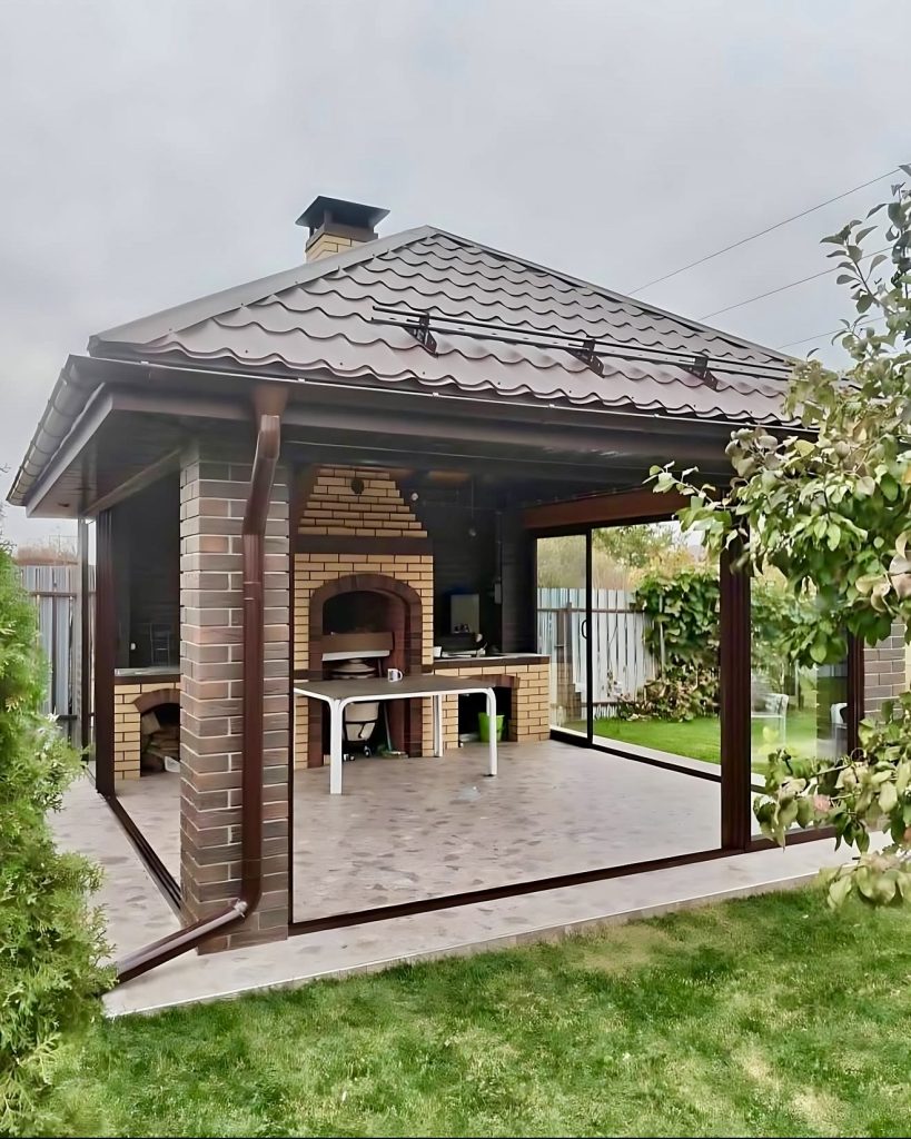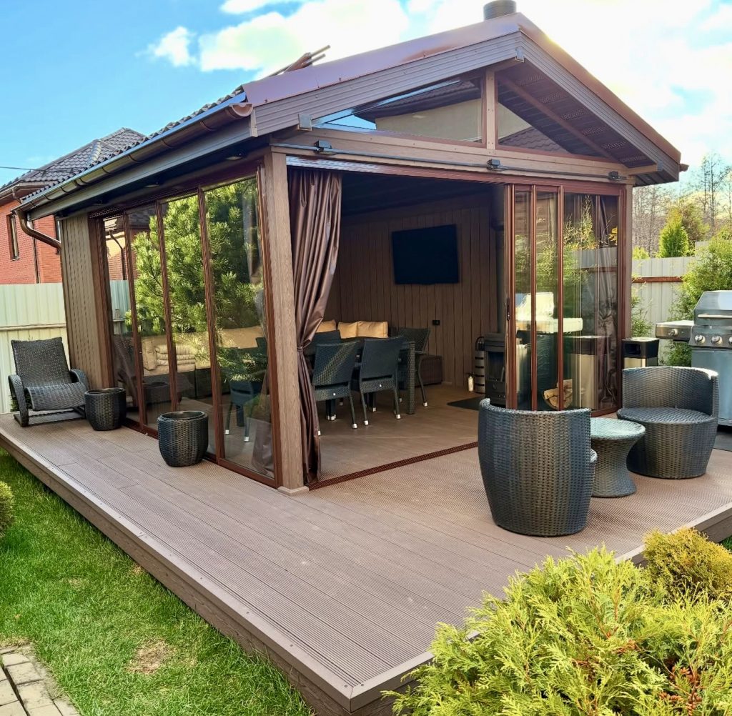 Featuring sliding glass doors, this fully enclosed gazebo serves as a year-round retreat. Inside, a dining table and seating area make it perfect for hosting dinners or parties. Curtains provide privacy and flexibility, while the space feels like a natural extension of the home. This design suits homeowners seeking durable, stylish outdoor living beyond budget builds.