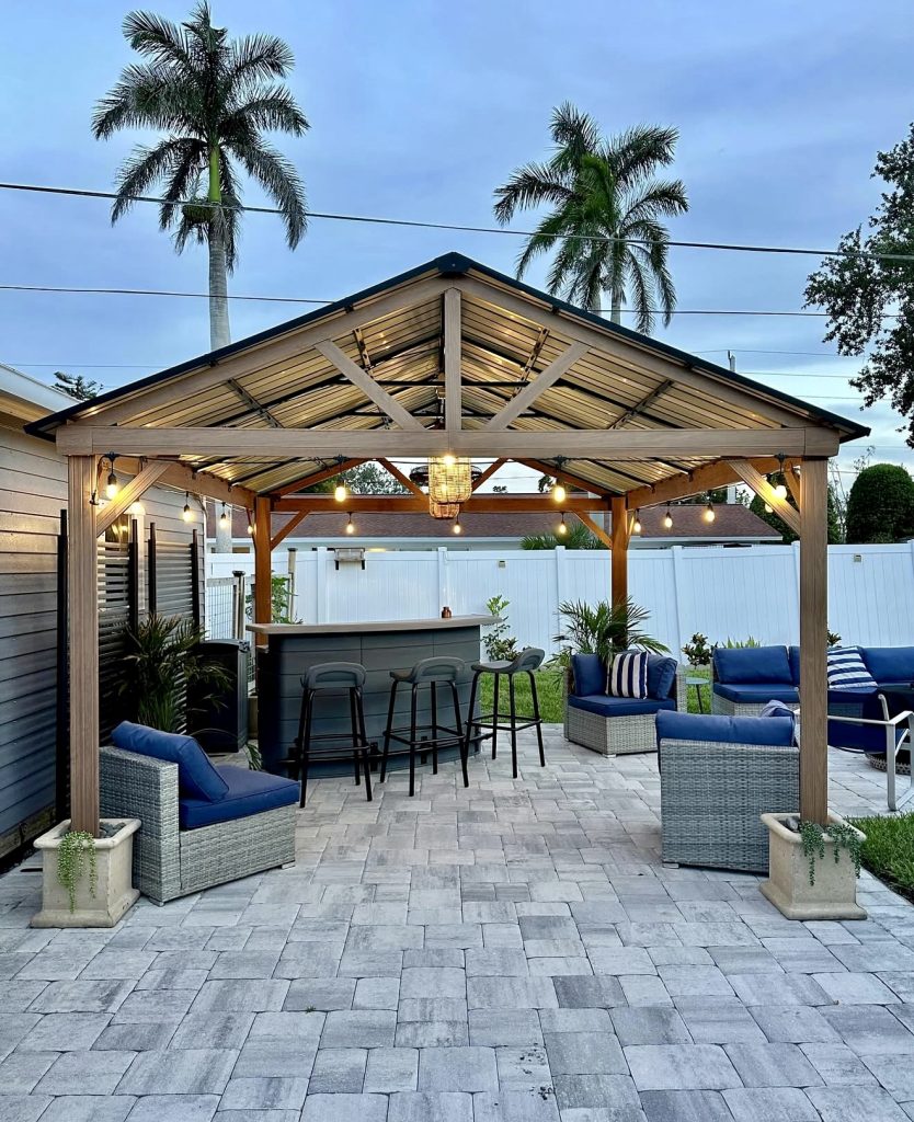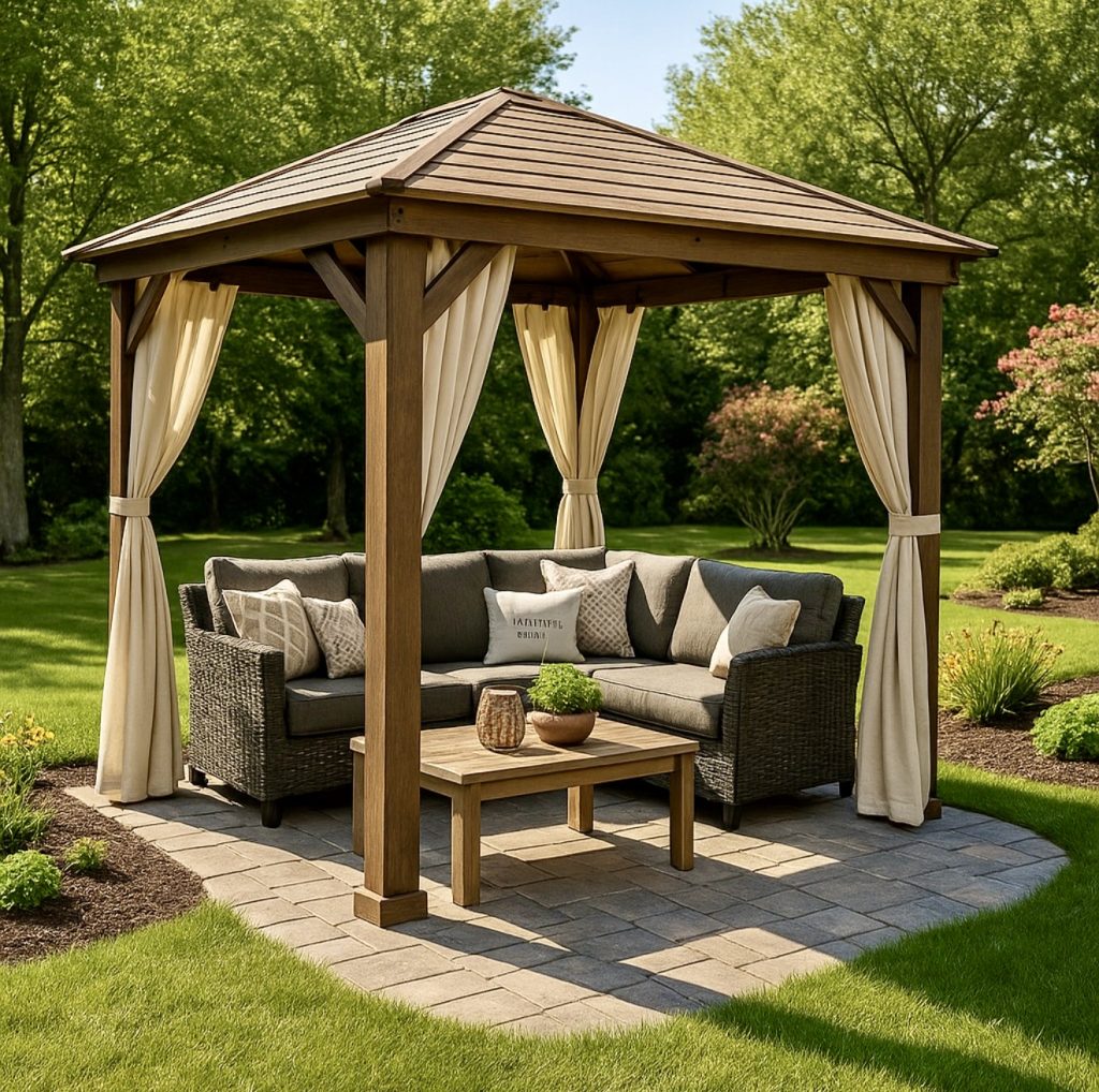 This wooden gazebo balances structure and comfort with a simple covered roof and tied-back curtains. A sectional sofa creates an outdoor enclosed living room feel, perfect for intimate conversations or quiet moments. Neutral tones keep the space versatile, while a paved foundation adds a refined finish. This design proves that stylish retreats can be achieved without overspending.