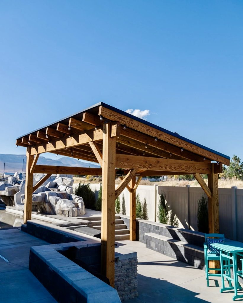 This pavilion combines the durability of wood with a sleek pitched roof, creating a rustic yet modern aesthetic. Its open layout is perfect for entertaining, accommodating dining and lounging areas. Ambient lighting under the beams fosters a warm, inviting atmosphere after dark. Stone accents nearby add a touch of sophistication, demonstrating how a DIY project can achieve a high-end look.