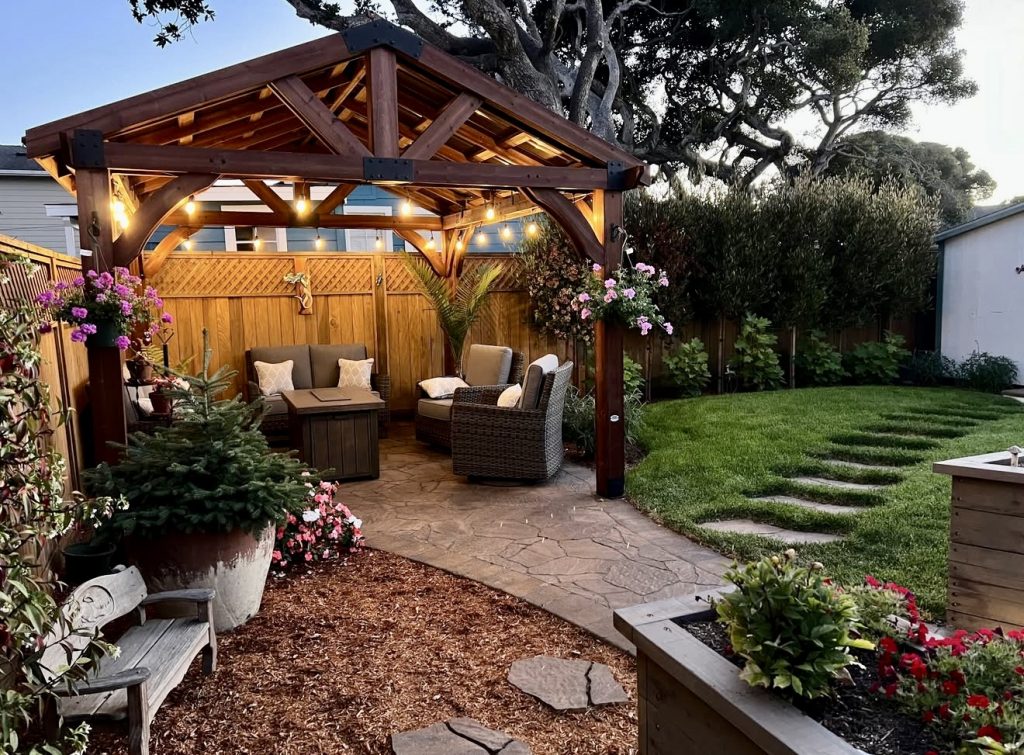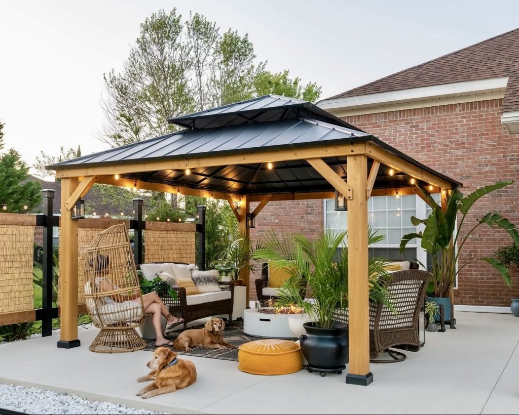 This large gazebo showcases how thoughtful design can create a stylish yet cozy space. Swing chairs, plush sofas, and abundant greenery cultivate a relaxed bohemian vibe. The pitched roof and string lights overhead provide a welcoming glow for nighttime use. This setup highlights the power of combining simple structures with layered textures to enhance comfort, appealing to families and pet owners alike.