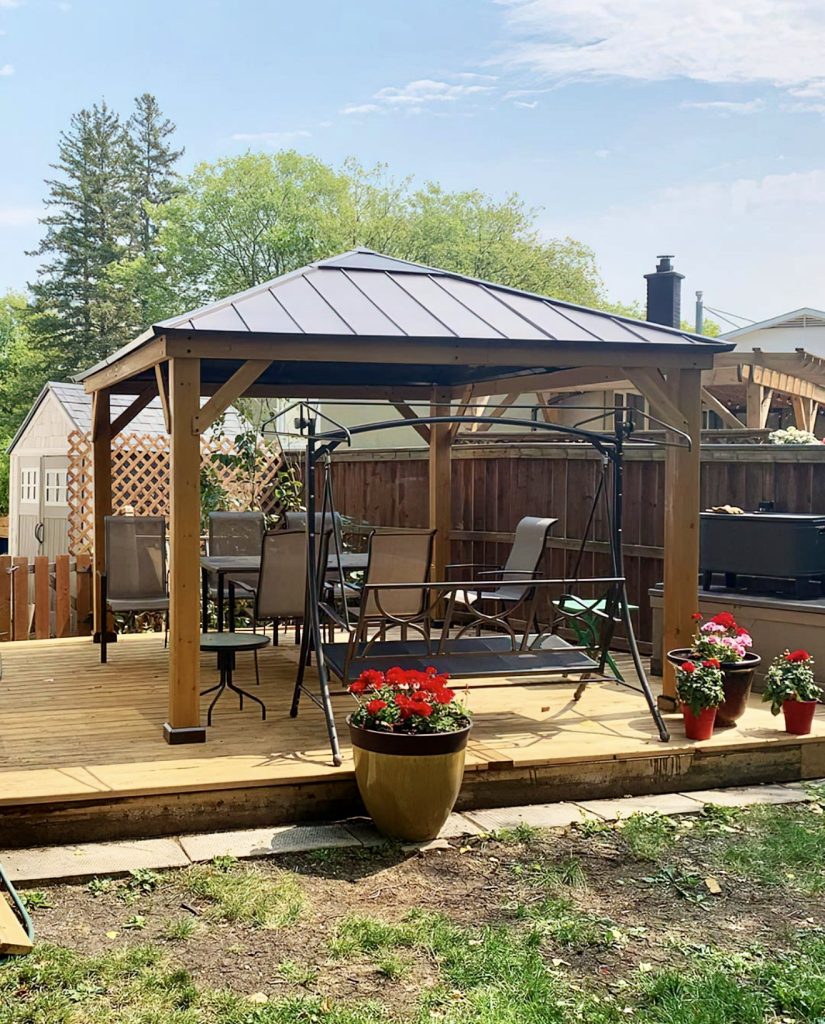 Perched on a raised deck, this wooden gazebo offers a polished and structured backyard feature. A dining table and swing provide multifunctional comfort for meals and relaxation. Bright potted flowers add seasonal charm and color, enhancing the overall aesthetic. Its straightforward design makes it an excellent choice for budget-conscious or DIY projects, ideal for smaller yards.