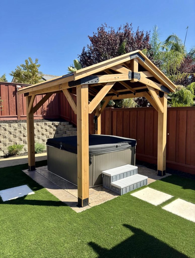 Designed specifically for hot tub use, this wooden gazebo combines rustic charm with functionality. Open sides ensure ventilation, while the pitched roof protects the spa from weather. The sturdy frame adds durability and character, making it a refined yet affordable option for year-round backyard relaxation.