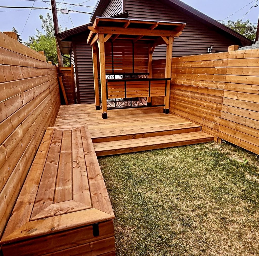 Maximizing a small corner yard, this gazebo sits on a raised deck with a rustic wooden finish. Built-in bench seating and privacy fencing create an intimate outdoor nook. This design inspires homeowners seeking DIY projects that enhance backyard functionality without sacrificing style.