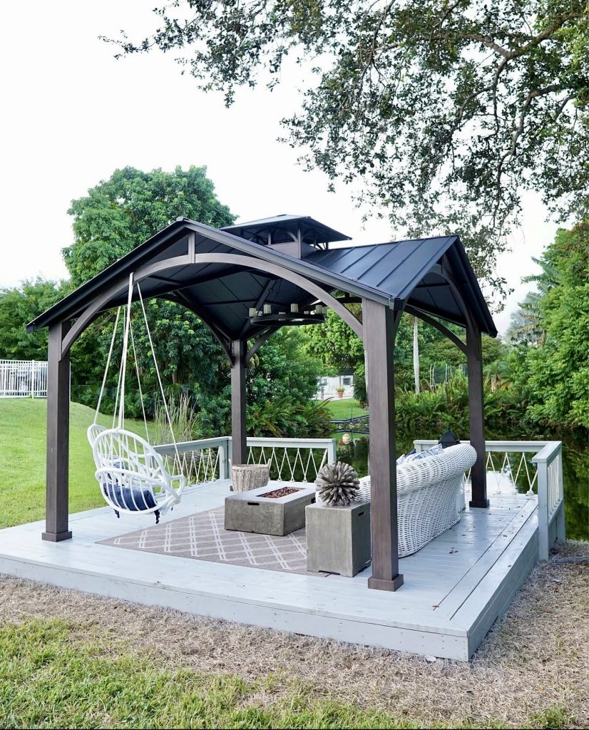 Elevated on a deck, this modern gazebo boasts clean lines and stylish furnishings. A hanging swing chair adds a playful yet relaxing element, while neutral tones paired with a geometric rug and fire pit table create a polished look. The open design offers shade and fresh air, perfectly balancing comfort and minimalism.