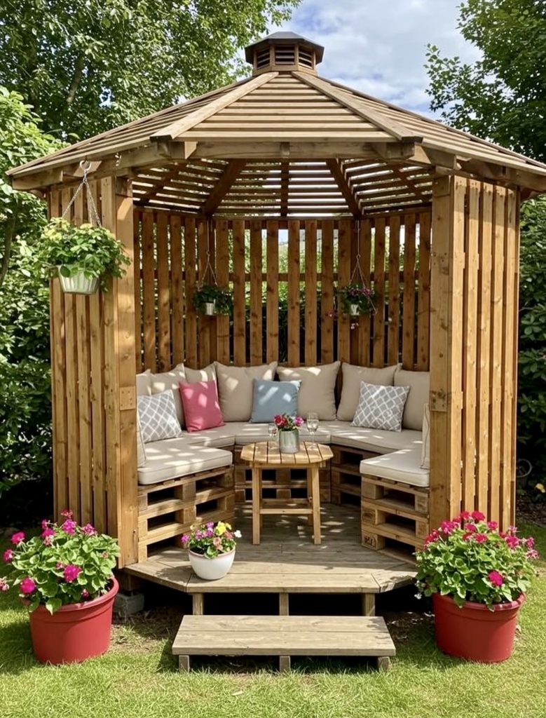 This octagonal wooden gazebo serves as a charming garden centerpiece. Built-in bench seating with vibrant cushions creates a welcoming spot for relaxation or conversation. Hanging planters and colorful flowers add life and personality. Its straightforward yet creative design is suitable for experienced DIYers aiming for a warm and timeless outdoor feature.