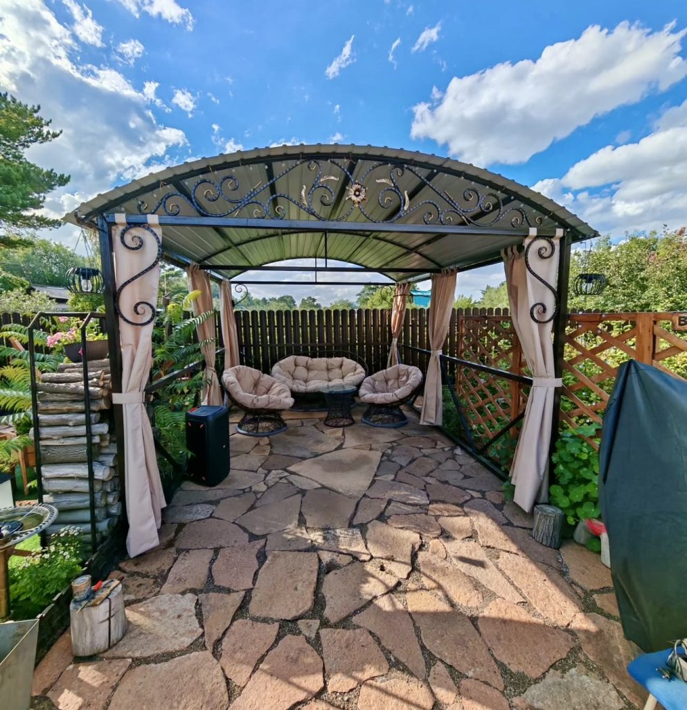 Featuring intricate metalwork, this rustic gazebo offers a unique take on traditional backyard structures. The curved roof and decorative posts add elegance, while curtains provide privacy and enclosure. Cushioned seating ensures comfort, and stone flooring adds durability and grounding. This design is perfect for lovers of vintage aesthetics seeking a stylish yet cozy outdoor retreat.