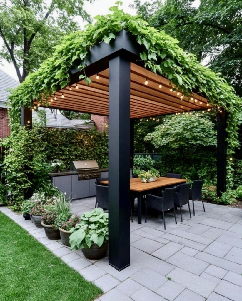 This design features sleek black columns enveloped by cascading greenery, creating a natural canopy that offers shade and privacy. Twinkling string lights strung beneath the beams add a warm glow for evening meals. Adjacent to the dining area, a built-in grill enhances outdoor cooking experiences, making it ideal for family gatherings or summer celebrations. This setup exemplifies how thoughtful use of plants and lighting can elevate a modest budget project to feel luxurious.