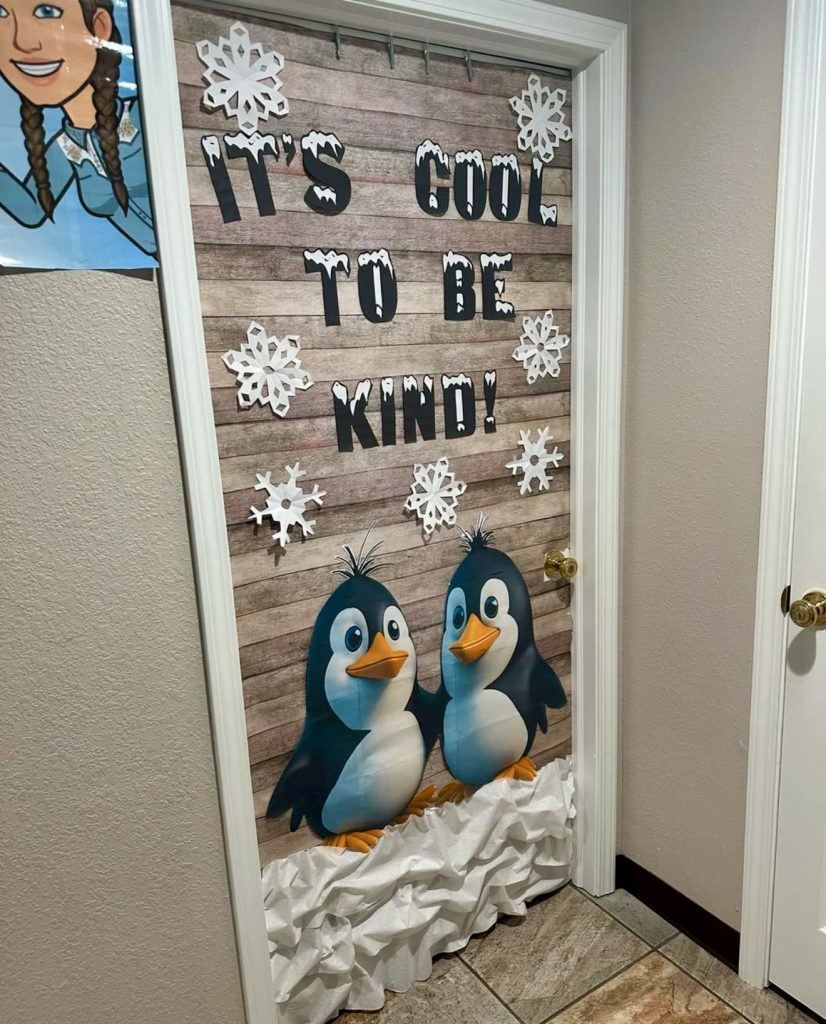 Featuring the uplifting slogan “It’s Cool to Be Kind,” this door combines adorable penguin illustrations with snowflakes to promote kindness and empathy. Perfect for Preschool and Elementary classrooms, it cleverly ties winter decor to social-emotional learning, reminding students that kindness is timeless and always in season.