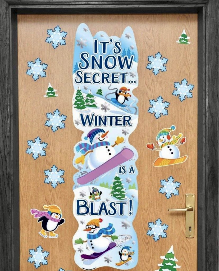 This imaginative door features a curious polar bear peeking through a frosted window, complemented by snowflakes and snowmen. It’s an excellent choice for Science classrooms or Libraries, where fostering curiosity about nature and the environment is key. The minimalist design proves that simplicity can still deliver a powerful seasonal message.
