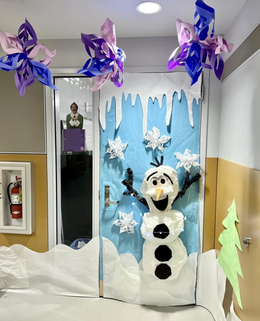 Bringing the beloved snowman Olaf to life, this door bursts with personality and humor. Large paper snowflakes and vivid colors create a three-dimensional igloo effect, making it a standout decoration. Ideal for Preschool and Middle school classrooms, this design reminds us that even the coldest days can be brightened with laughter and imagination.
